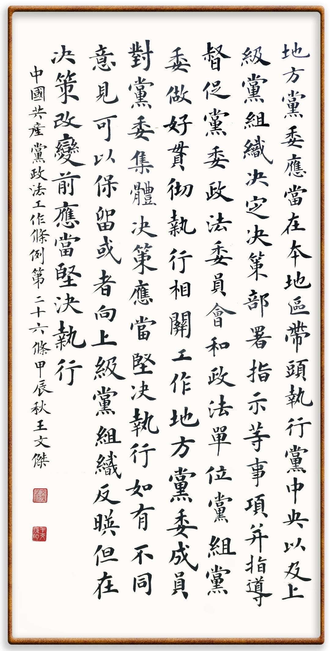 《中國(guó)共產(chǎn)黨政法工作條例》對(duì)黨領(lǐng)導(dǎo)新時(shí)代政法工作進(jìn)行全面制度擘畫(huà),為黨領(lǐng)導(dǎo)政法工作提供基本遵循,具有重大而深遠(yuǎn)的意義。為學(xué)習(xí)好、宣傳好、貫徹好、實(shí)施好這部黨內(nèi)法規(guī),繼《中華人民共和國(guó)民法典》《中華人民共和國(guó)憲法》《信訪工作條例》《中華人民共和國(guó)澳門(mén)特別行政區(qū)基本法》《中華人民共和國(guó)香港特別行政區(qū)基本法》等法律法規(guī)之后,“書(shū)·法”系列活動(dòng)將筆端對(duì)準(zhǔn)《中國(guó)共產(chǎn)黨政法工作條例》。