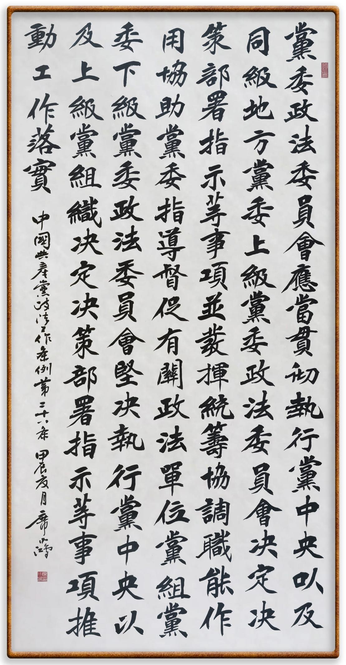《中國(guó)共產(chǎn)黨政法工作條例》對(duì)黨領(lǐng)導(dǎo)新時(shí)代政法工作進(jìn)行全面制度擘畫,為黨領(lǐng)導(dǎo)政法工作提供基本遵循,具有重大而深遠(yuǎn)的意義。為學(xué)習(xí)好、宣傳好、貫徹好、實(shí)施好這部黨內(nèi)法規(guī),繼《中華人民共和國(guó)民法典》《中華人民共和國(guó)憲法》《信訪工作條例》《中華人民共和國(guó)澳門特別行政區(qū)基本法》《中華人民共和國(guó)香港特別行政區(qū)基本法》等法律法規(guī)之后,“書·法”系列活動(dòng)將筆端對(duì)準(zhǔn)《中國(guó)共產(chǎn)黨政法工作條例》。