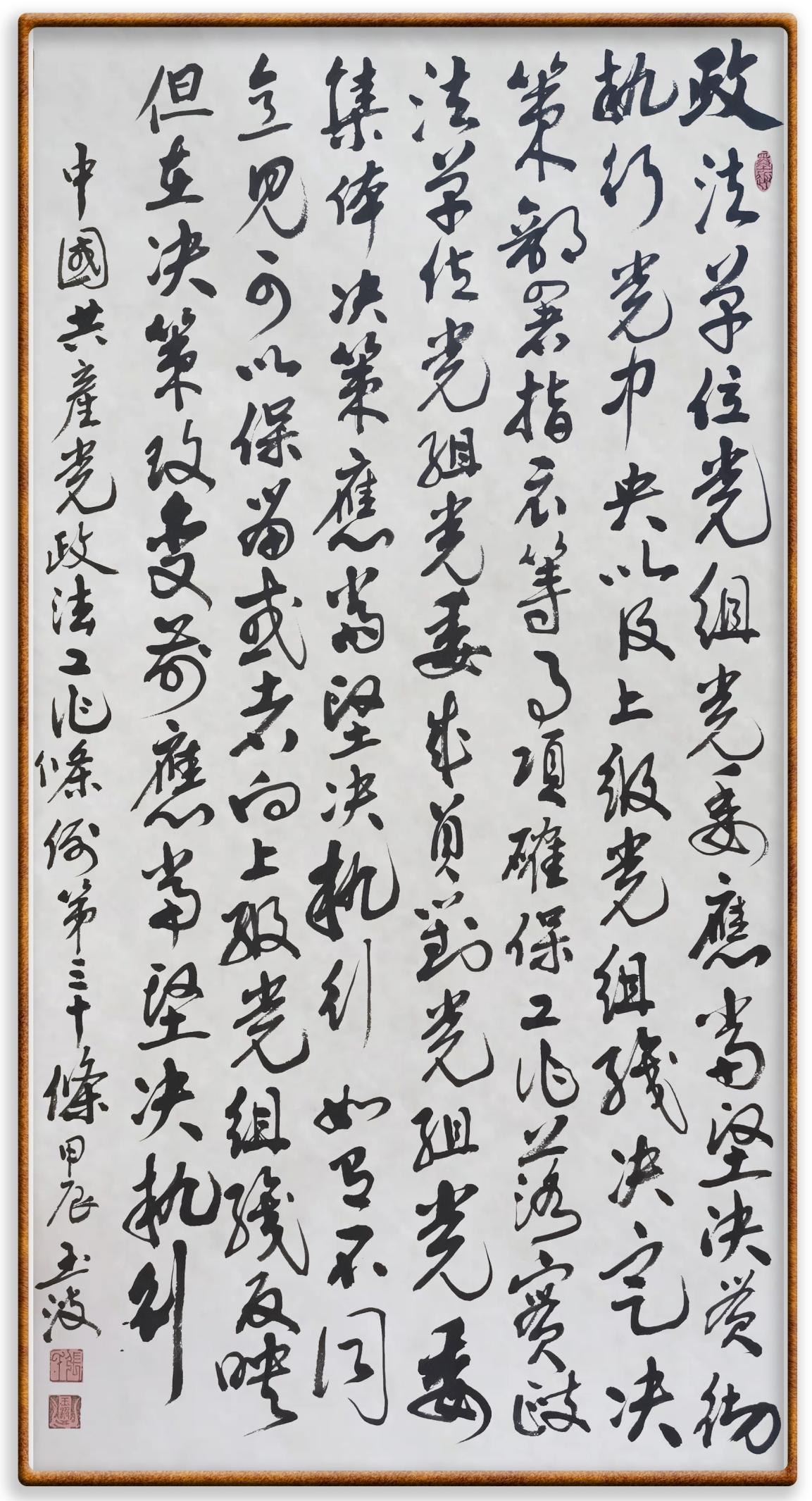 《中國共產(chǎn)黨政法工作條例》對黨領(lǐng)導(dǎo)新時代政法工作進行全面制度擘畫,為黨領(lǐng)導(dǎo)政法工作提供基本遵循,具有重大而深遠的意義。為學(xué)習(xí)好、宣傳好、貫徹好、實施好這部黨內(nèi)法規(guī),繼《中華人民共和國民法典》《中華人民共和國憲法》《信訪工作條例》《中華人民共和國澳門特別行政區(qū)基本法》《中華人民共和國香港特別行政區(qū)基本法》等法律法規(guī)之后,“書·法”系列活動將筆端對準(zhǔn)《中國共產(chǎn)黨政法工作條例》。