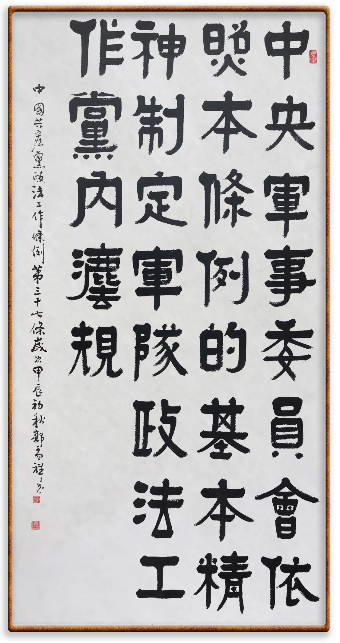 《中國共產黨政法工作條例》對黨領導新時代政法工作進行全面制度擘畫,為黨領導政法工作提供基本遵循,具有重大而深遠的意義。為學習好、宣傳好、貫徹好、實施好這部黨內法規(guī),繼《中華人民共和國民法典》《中華人民共和國憲法》《信訪工作條例》《中華人民共和國澳門特別行政區(qū)基本法》《中華人民共和國香港特別行政區(qū)基本法》等法律法規(guī)之后,“書·法”系列活動將筆端對準《中國共產黨政法工作條例》。