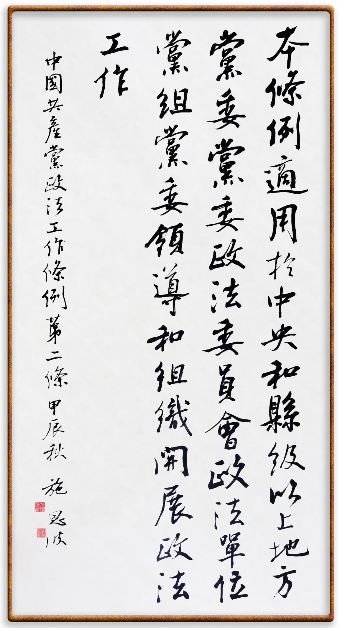 《中國共產(chǎn)黨政法工作條例》對(duì)黨領(lǐng)導(dǎo)新時(shí)代政法工作進(jìn)行全面制度擘畫,為黨領(lǐng)導(dǎo)政法工作提供基本遵循,具有重大而深遠(yuǎn)的意義。為學(xué)習(xí)好、宣傳好、貫徹好、實(shí)施好這部黨內(nèi)法規(guī),繼《中華人民共和國民法典》《中華人民共和國憲法》《信訪工作條例》《中華人民共和國澳門特別行政區(qū)基本法》《中華人民共和國香港特別行政區(qū)基本法》等法律法規(guī)之后,“書·法”系列活動(dòng)將筆端對(duì)準(zhǔn)《中國共產(chǎn)黨政法工作條例》。