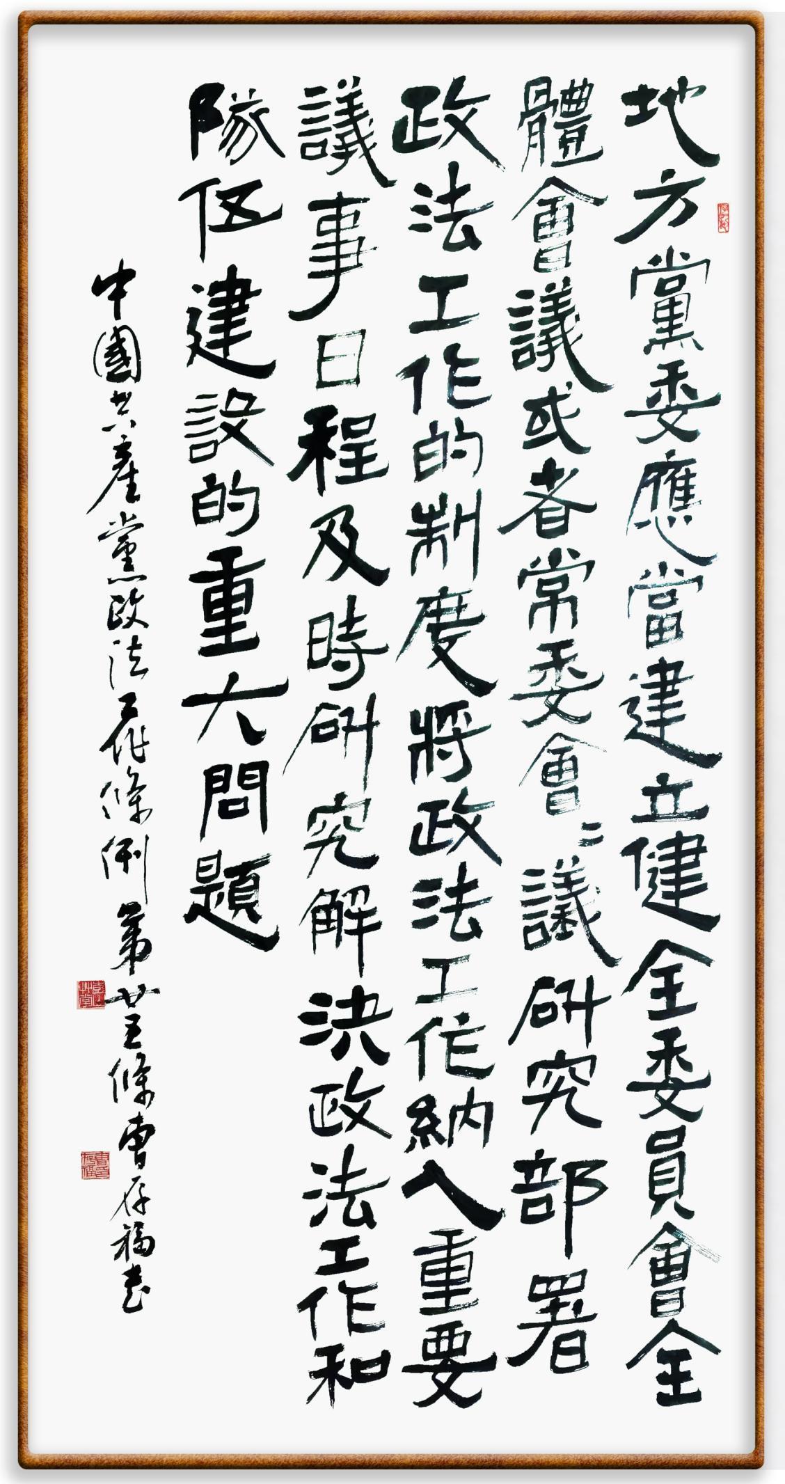 《中國共產(chǎn)黨政法工作條例》對黨領(lǐng)導(dǎo)新時代政法工作進行全面制度擘畫,為黨領(lǐng)導(dǎo)政法工作提供基本遵循,具有重大而深遠的意義。為學(xué)習(xí)好、宣傳好、貫徹好、實施好這部黨內(nèi)法規(guī),繼《中華人民共和國民法典》《中華人民共和國憲法》《信訪工作條例》《中華人民共和國澳門特別行政區(qū)基本法》《中華人民共和國香港特別行政區(qū)基本法》等法律法規(guī)之后,“書·法”系列活動將筆端對準《中國共產(chǎn)黨政法工作條例》。