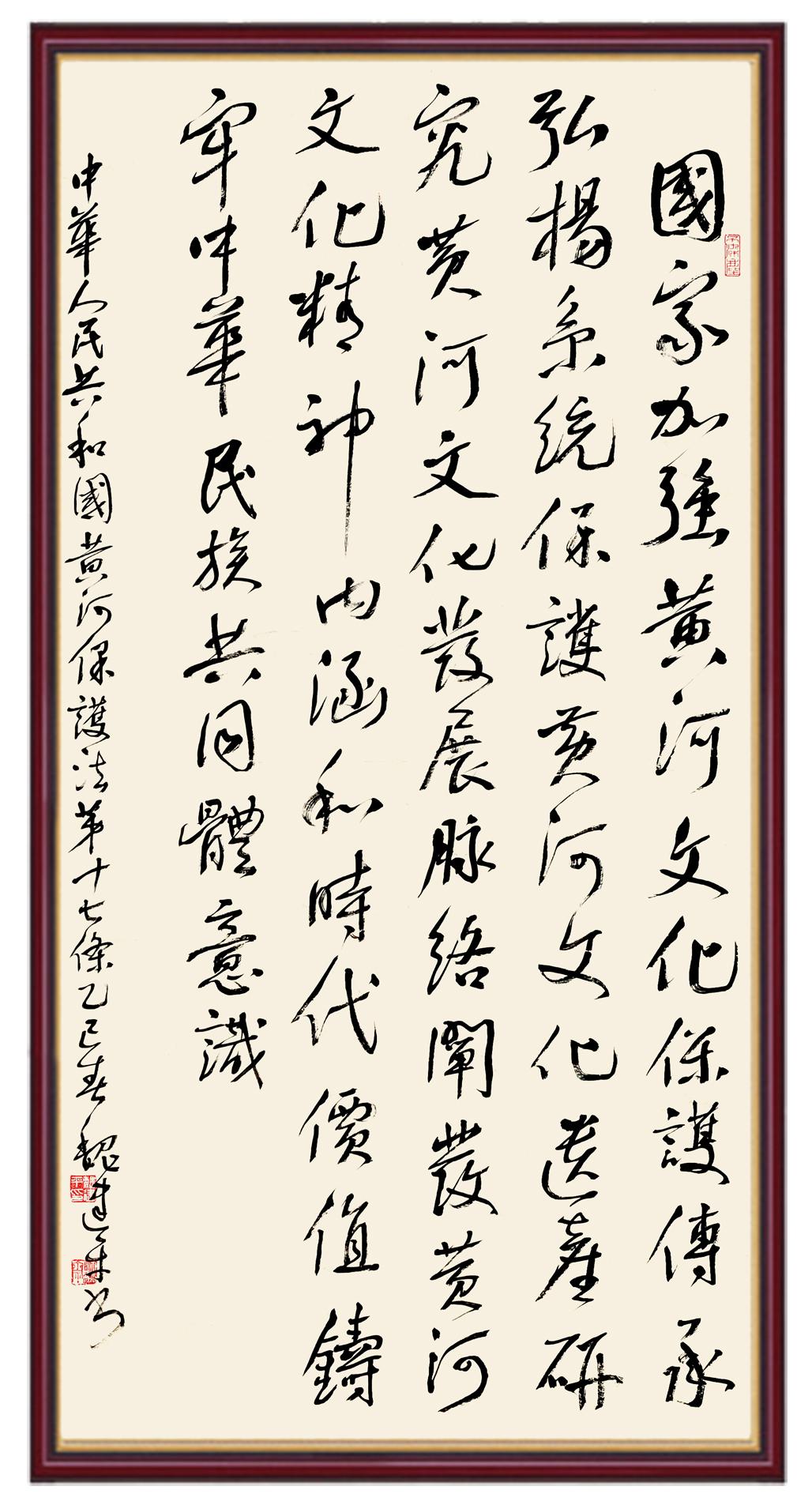 黃河寧,天下平。黃河是中華民族的發(fā)源地和搖籃,保護(hù)黃河是事關(guān)中華民族偉大復(fù)興的千秋大計(jì)?!吨腥A人民共和國(guó)黃河保護(hù)法》為推進(jìn)水資源節(jié)約集約利用、保護(hù)傳承弘揚(yáng)黃河文化、推動(dòng)黃河流域生態(tài)保護(hù)和高質(zhì)量發(fā)展提供了有力法治保障。繼書(shū)寫(xiě)《中華人民共和國(guó)民法典》《中華人民共和國(guó)憲法》《中華人民共和國(guó)澳門特別行政區(qū)基本法》《中華人民共和國(guó)香港特別行政區(qū)基本法》《中華人民共和國(guó)國(guó)旗法》《中華人民共和國(guó)國(guó)徽法》《中華人民共和國(guó)國(guó)歌法》《中華人民共和國(guó)法官法》等法律法規(guī)之后,法制日?qǐng)?bào)社聯(lián)合沿黃九?。▍^(qū))司法廳、書(shū)法家協(xié)會(huì),將筆端對(duì)準(zhǔn)《中華人民共和國(guó)黃河保護(hù)法》。