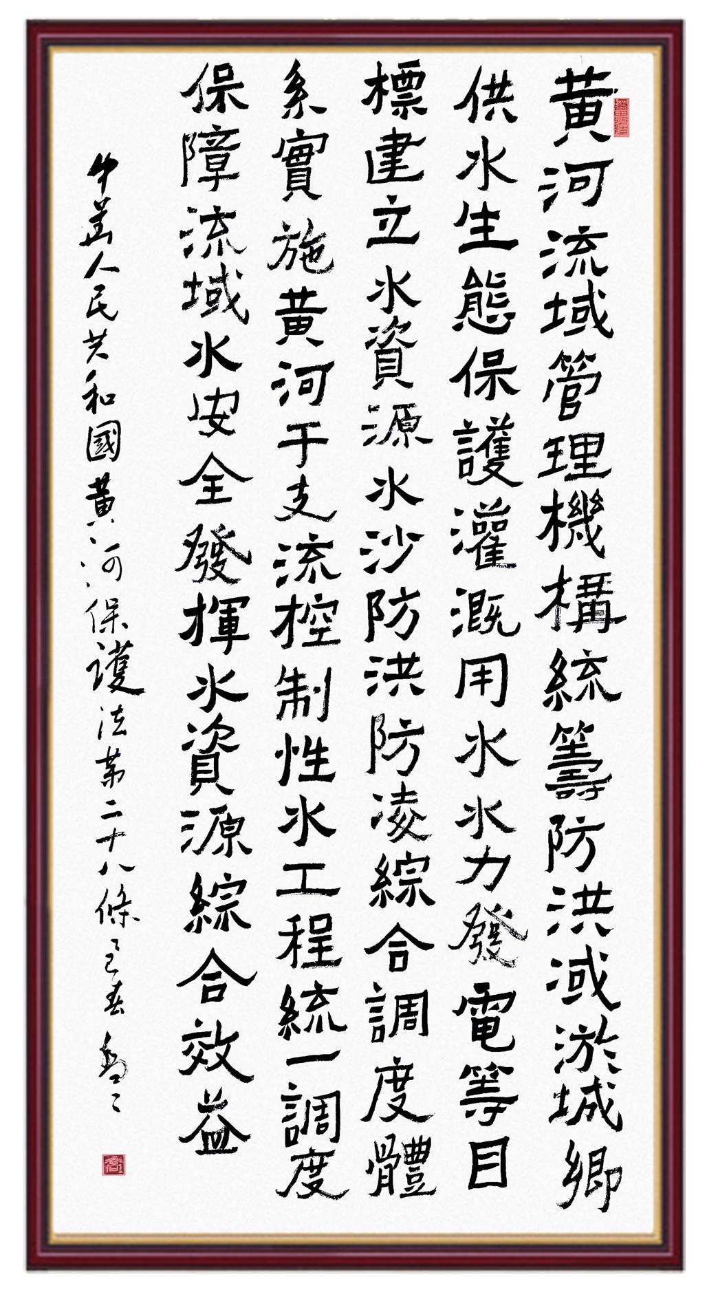 黃河寧,天下平。黃河是中華民族的發(fā)源地和搖籃,保護黃河是事關中華民族偉大復興的千秋大計?!吨腥A人民共和國黃河保護法》為推進水資源節(jié)約集約利用、保護傳承弘揚黃河文化、推動黃河流域生態(tài)保護和高質(zhì)量發(fā)展提供了有力法治保障。繼書寫《中華人民共和國民法典》《中華人民共和國憲法》《中華人民共和國澳門特別行政區(qū)基本法》《中華人民共和國香港特別行政區(qū)基本法》《中華人民共和國國旗法》《中華人民共和國國徽法》《中華人民共和國國歌法》《中華人民共和國法官法》等法律法規(guī)之后,法制日報社聯(lián)合沿黃九?。▍^(qū))司法廳、書法家協(xié)會,將筆端對準《中華人民共和國黃河保護法》。