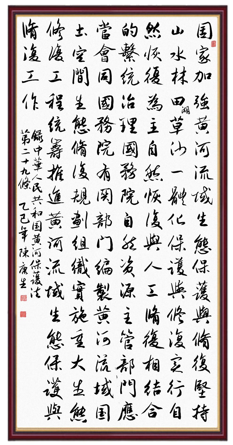黃河寧,天下平。黃河是中華民族的發(fā)源地和搖籃,保護黃河是事關(guān)中華民族偉大復興的千秋大計?!吨腥A人民共和國黃河保護法》為推進水資源節(jié)約集約利用、保護傳承弘揚黃河文化、推動黃河流域生態(tài)保護和高質(zhì)量發(fā)展提供了有力法治保障。繼書寫《中華人民共和國民法典》《中華人民共和國憲法》《中華人民共和國澳門特別行政區(qū)基本法》《中華人民共和國香港特別行政區(qū)基本法》《中華人民共和國國旗法》《中華人民共和國國徽法》《中華人民共和國國歌法》《中華人民共和國法官法》等法律法規(guī)之后,法制日報社聯(lián)合沿黃九?。▍^(qū))司法廳、書法家協(xié)會,將筆端對準《中華人民共和國黃河保護法》。