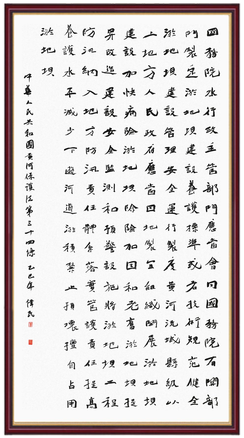 黃河寧,天下平。黃河是中華民族的發(fā)源地和搖籃,保護黃河是事關(guān)中華民族偉大復(fù)興的千秋大計。《中華人民共和國黃河保護法》為推進水資源節(jié)約集約利用、保護傳承弘揚黃河文化、推動黃河流域生態(tài)保護和高質(zhì)量發(fā)展提供了有力法治保障。繼書寫《中華人民共和國民法典》《中華人民共和國憲法》《中華人民共和國澳門特別行政區(qū)基本法》《中華人民共和國香港特別行政區(qū)基本法》《中華人民共和國國旗法》《中華人民共和國國徽法》《中華人民共和國國歌法》《中華人民共和國法官法》等法律法規(guī)之后,法制日報社聯(lián)合沿黃九?。▍^(qū))司法廳、書法家協(xié)會,將筆端對準《中華人民共和國黃河保護法》。