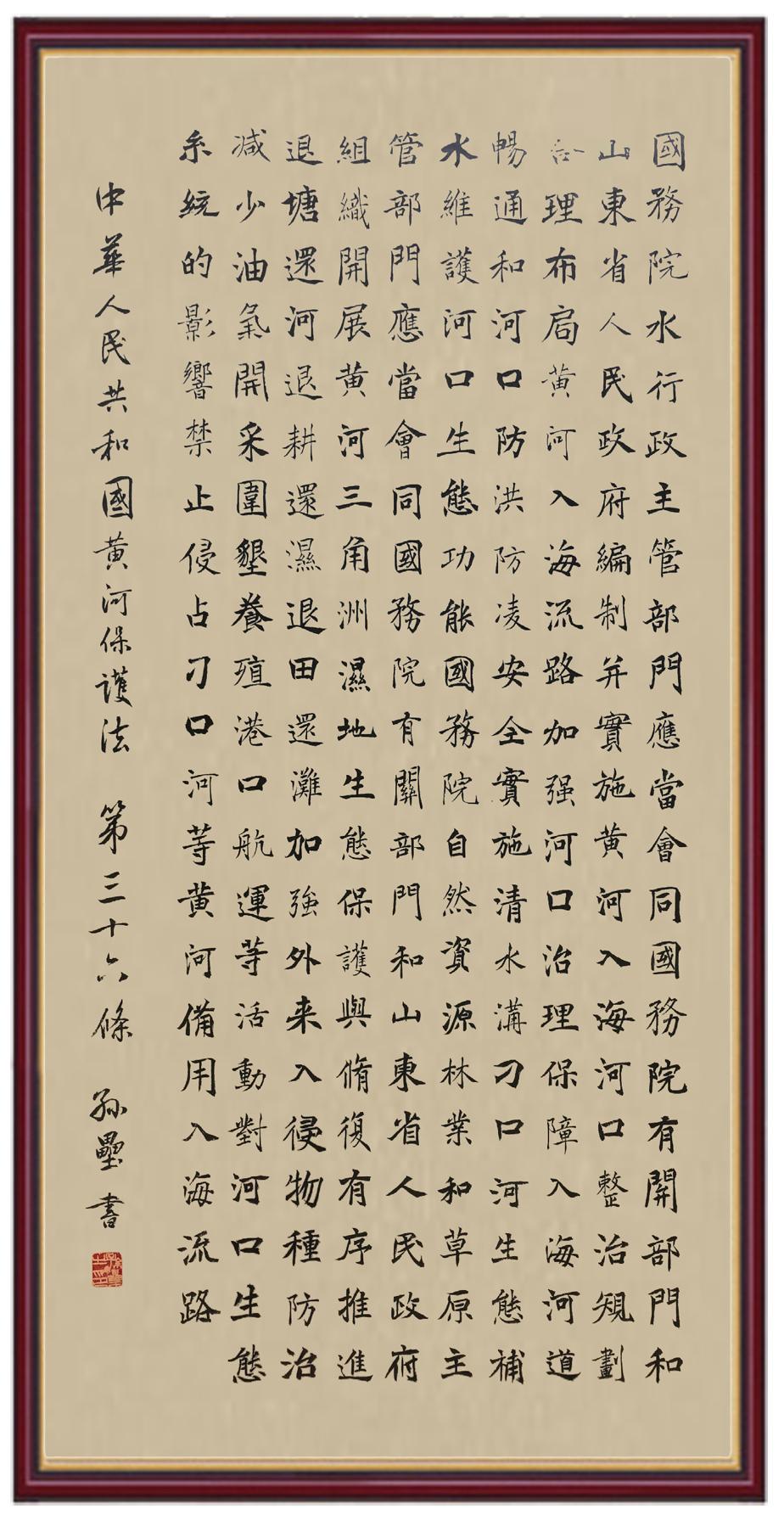 黃河寧,天下平。黃河是中華民族的發(fā)源地和搖籃,保護(hù)黃河是事關(guān)中華民族偉大復(fù)興的千秋大計(jì)?!吨腥A人民共和國(guó)黃河保護(hù)法》為推進(jìn)水資源節(jié)約集約利用、保護(hù)傳承弘揚(yáng)黃河文化、推動(dòng)黃河流域生態(tài)保護(hù)和高質(zhì)量發(fā)展提供了有力法治保障。繼書(shū)寫(xiě)《中華人民共和國(guó)民法典》《中華人民共和國(guó)憲法》《中華人民共和國(guó)澳門(mén)特別行政區(qū)基本法》《中華人民共和國(guó)香港特別行政區(qū)基本法》《中華人民共和國(guó)國(guó)旗法》《中華人民共和國(guó)國(guó)徽法》《中華人民共和國(guó)國(guó)歌法》《中華人民共和國(guó)法官法》等法律法規(guī)之后,法制日?qǐng)?bào)社聯(lián)合沿黃九省(區(qū))司法廳、書(shū)法家協(xié)會(huì),將筆端對(duì)準(zhǔn)《中華人民共和國(guó)黃河保護(hù)法》。