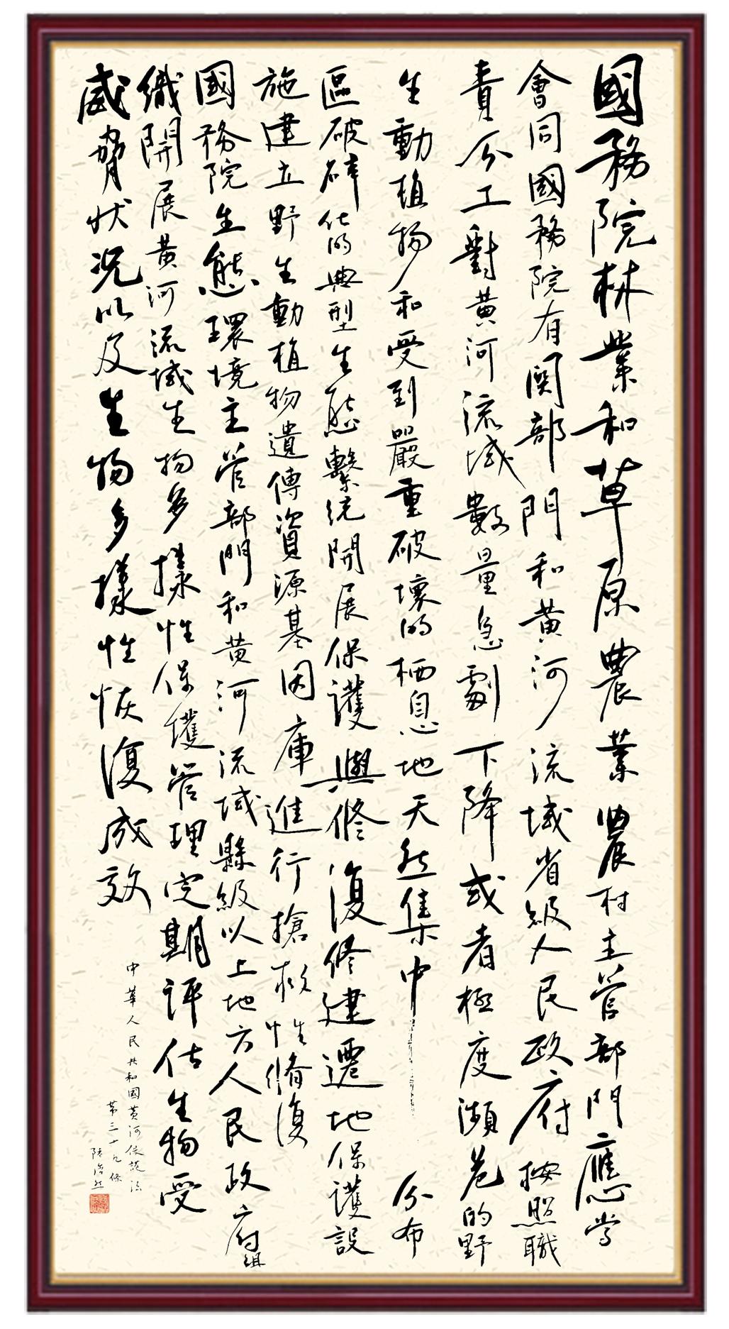 黃河寧,天下平。黃河是中華民族的發(fā)源地和搖籃,保護黃河是事關中華民族偉大復興的千秋大計。《中華人民共和國黃河保護法》為推進水資源節(jié)約集約利用、保護傳承弘揚黃河文化、推動黃河流域生態(tài)保護和高質量發(fā)展提供了有力法治保障。繼書寫《中華人民共和國民法典》《中華人民共和國憲法》《中華人民共和國澳門特別行政區(qū)基本法》《中華人民共和國香港特別行政區(qū)基本法》《中華人民共和國國旗法》《中華人民共和國國徽法》《中華人民共和國國歌法》《中華人民共和國法官法》等法律法規(guī)之后,法制日報社聯合沿黃九省(區(qū))司法廳、書法家協(xié)會,將筆端對準《中華人民共和國黃河保護法》。