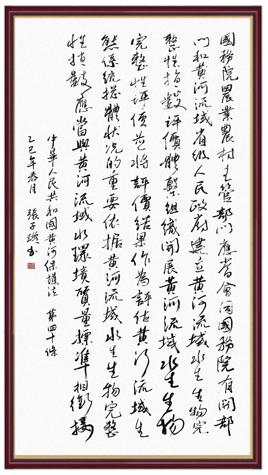 黃河寧,天下平。黃河是中華民族的發(fā)源地和搖籃,保護(hù)黃河是事關(guān)中華民族偉大復(fù)興的千秋大計(jì)?!吨腥A人民共和國(guó)黃河保護(hù)法》為推進(jìn)水資源節(jié)約集約利用、保護(hù)傳承弘揚(yáng)黃河文化、推動(dòng)黃河流域生態(tài)保護(hù)和高質(zhì)量發(fā)展提供了有力法治保障。繼書寫《中華人民共和國(guó)民法典》《中華人民共和國(guó)憲法》《中華人民共和國(guó)澳門特別行政區(qū)基本法》《中華人民共和國(guó)香港特別行政區(qū)基本法》《中華人民共和國(guó)國(guó)旗法》《中華人民共和國(guó)國(guó)徽法》《中華人民共和國(guó)國(guó)歌法》《中華人民共和國(guó)法官法》等法律法規(guī)之后,法制日?qǐng)?bào)社聯(lián)合沿黃九省(區(qū))司法廳、書法家協(xié)會(huì),將筆端對(duì)準(zhǔn)《中華人民共和國(guó)黃河保護(hù)法》。