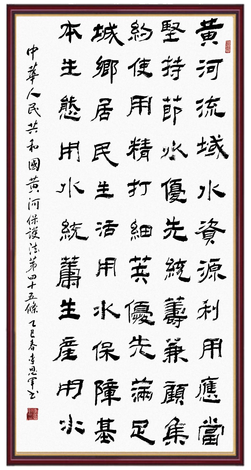 黃河寧,天下平。黃河是中華民族的發(fā)源地和搖籃,保護(hù)黃河是事關(guān)中華民族偉大復(fù)興的千秋大計(jì)?!吨腥A人民共和國(guó)黃河保護(hù)法》為推進(jìn)水資源節(jié)約集約利用、保護(hù)傳承弘揚(yáng)黃河文化、推動(dòng)黃河流域生態(tài)保護(hù)和高質(zhì)量發(fā)展提供了有力法治保障。繼書(shū)寫(xiě)《中華人民共和國(guó)民法典》《中華人民共和國(guó)憲法》《中華人民共和國(guó)澳門(mén)特別行政區(qū)基本法》《中華人民共和國(guó)香港特別行政區(qū)基本法》《中華人民共和國(guó)國(guó)旗法》《中華人民共和國(guó)國(guó)徽法》《中華人民共和國(guó)國(guó)歌法》《中華人民共和國(guó)法官法》等法律法規(guī)之后,法制日?qǐng)?bào)社聯(lián)合沿黃九?。▍^(qū))司法廳、書(shū)法家協(xié)會(huì),將筆端對(duì)準(zhǔn)《中華人民共和國(guó)黃河保護(hù)法》。