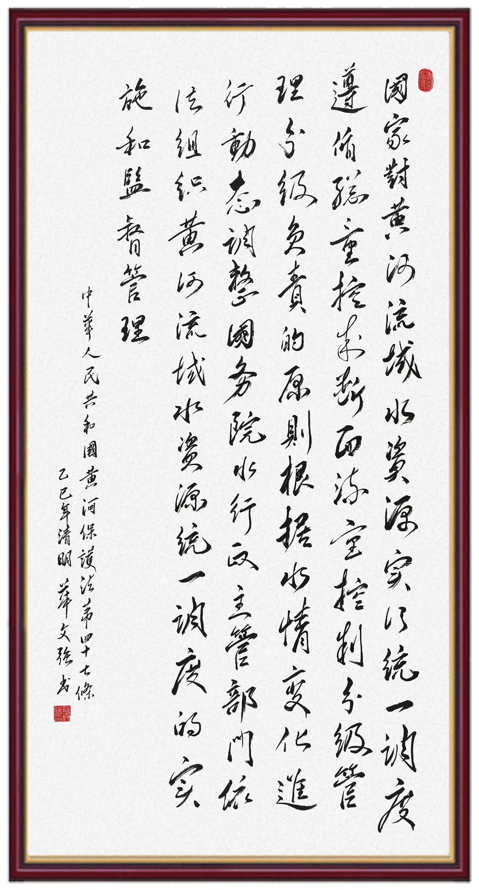 黃河寧,天下平。黃河是中華民族的發(fā)源地和搖籃,保護(hù)黃河是事關(guān)中華民族偉大復(fù)興的千秋大計(jì)?!吨腥A人民共和國(guó)黃河保護(hù)法》為推進(jìn)水資源節(jié)約集約利用、保護(hù)傳承弘揚(yáng)黃河文化、推動(dòng)黃河流域生態(tài)保護(hù)和高質(zhì)量發(fā)展提供了有力法治保障。繼書寫《中華人民共和國(guó)民法典》《中華人民共和國(guó)憲法》《中華人民共和國(guó)澳門特別行政區(qū)基本法》《中華人民共和國(guó)香港特別行政區(qū)基本法》《中華人民共和國(guó)國(guó)旗法》《中華人民共和國(guó)國(guó)徽法》《中華人民共和國(guó)國(guó)歌法》《中華人民共和國(guó)法官法》等法律法規(guī)之后,法制日?qǐng)?bào)社聯(lián)合沿黃九?。▍^(qū))司法廳、書法家協(xié)會(huì),將筆端對(duì)準(zhǔn)《中華人民共和國(guó)黃河保護(hù)法》。