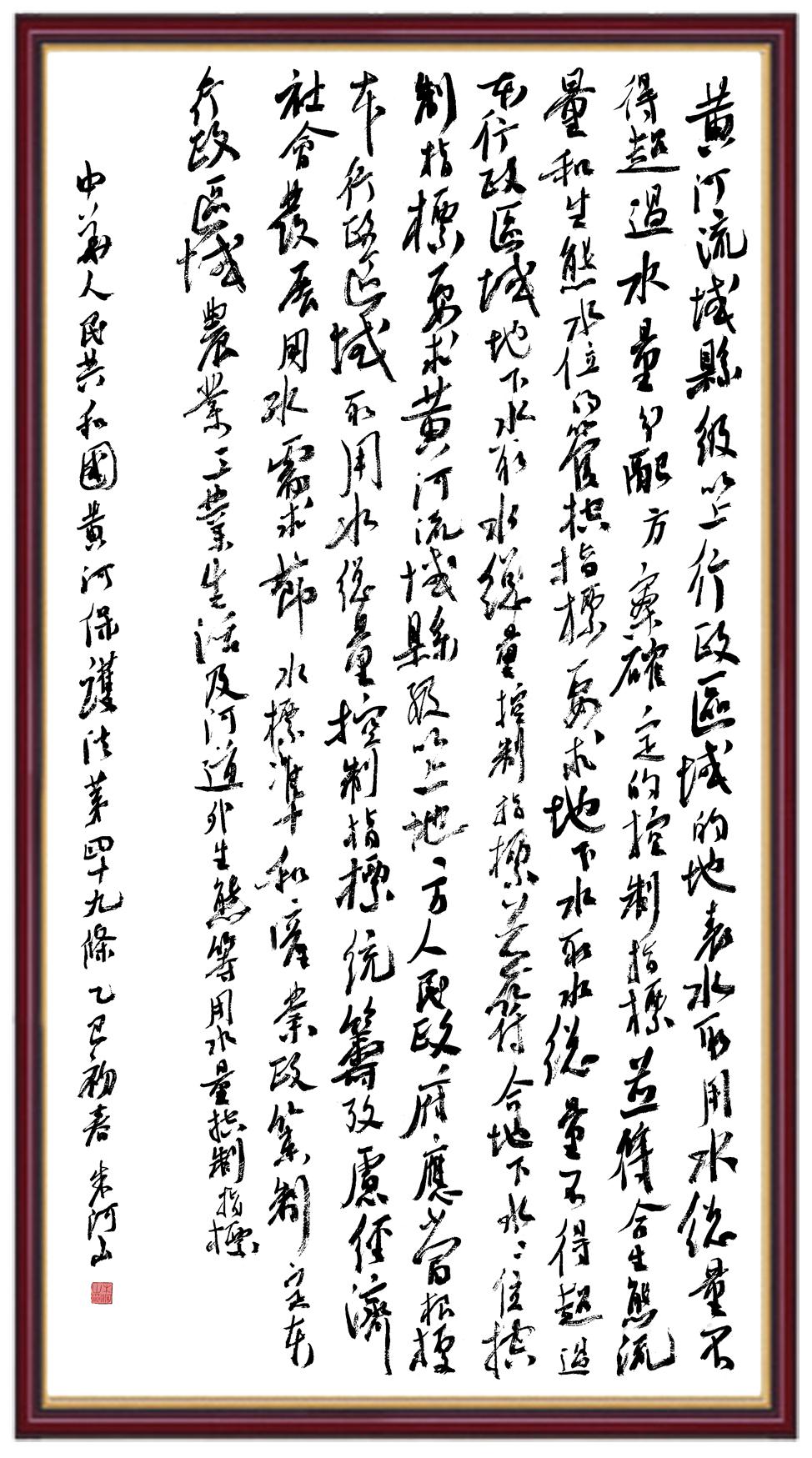 黃河寧,天下平。黃河是中華民族的發(fā)源地和搖籃,保護(hù)黃河是事關(guān)中華民族偉大復(fù)興的千秋大計(jì)?!吨腥A人民共和國(guó)黃河保護(hù)法》為推進(jìn)水資源節(jié)約集約利用、保護(hù)傳承弘揚(yáng)黃河文化、推動(dòng)黃河流域生態(tài)保護(hù)和高質(zhì)量發(fā)展提供了有力法治保障。繼書寫《中華人民共和國(guó)民法典》《中華人民共和國(guó)憲法》《中華人民共和國(guó)澳門特別行政區(qū)基本法》《中華人民共和國(guó)香港特別行政區(qū)基本法》《中華人民共和國(guó)國(guó)旗法》《中華人民共和國(guó)國(guó)徽法》《中華人民共和國(guó)國(guó)歌法》《中華人民共和國(guó)法官法》等法律法規(guī)之后,法制日?qǐng)?bào)社聯(lián)合沿黃九省(區(qū))司法廳、書法家協(xié)會(huì),將筆端對(duì)準(zhǔn)《中華人民共和國(guó)黃河保護(hù)法》。