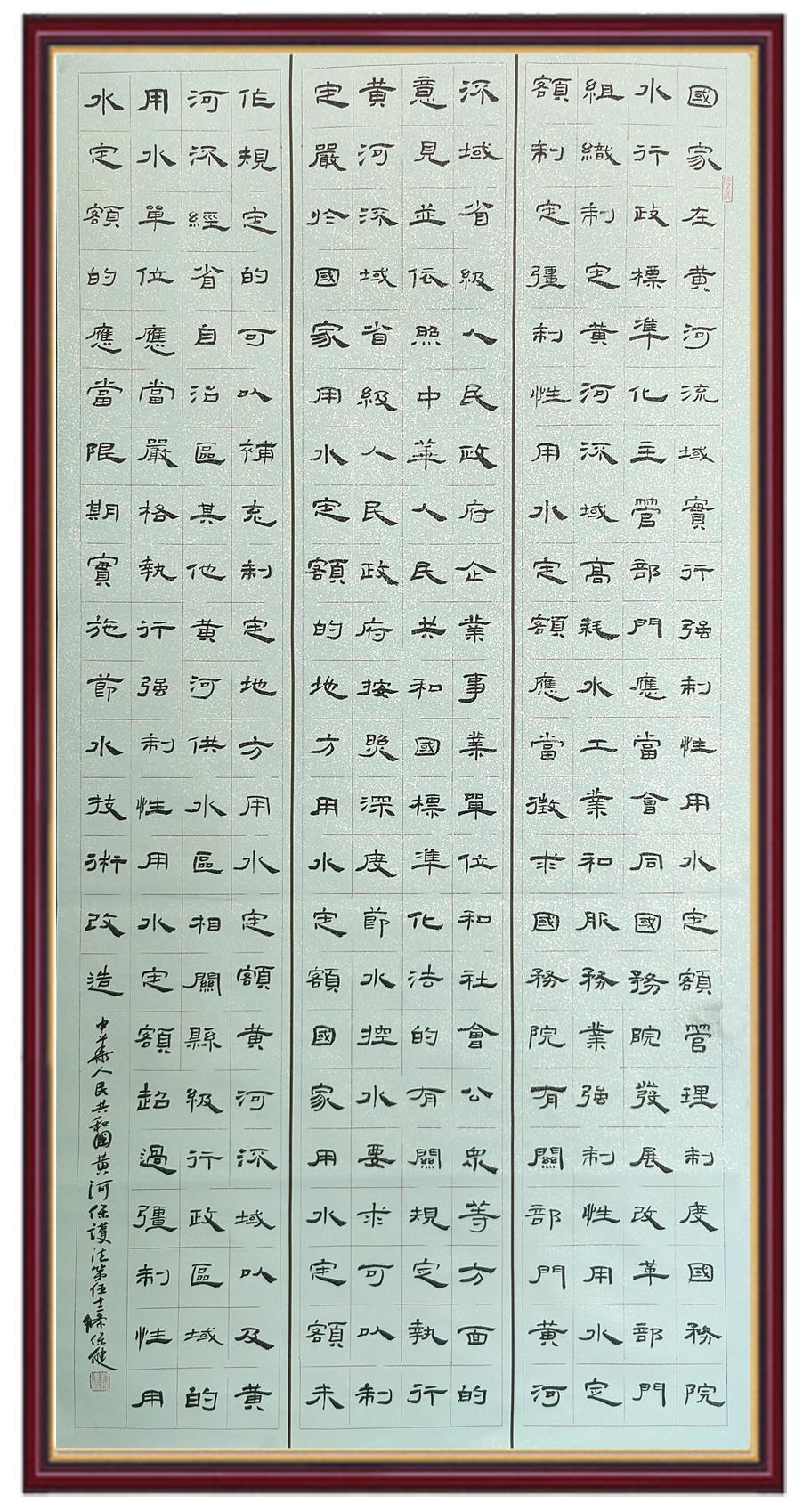 黃河寧,天下平。黃河是中華民族的發(fā)源地和搖籃,保護(hù)黃河是事關(guān)中華民族偉大復(fù)興的千秋大計。《中華人民共和國黃河保護(hù)法》為推進(jìn)水資源節(jié)約集約利用、保護(hù)傳承弘揚(yáng)黃河文化、推動黃河流域生態(tài)保護(hù)和高質(zhì)量發(fā)展提供了有力法治保障。繼書寫《中華人民共和國民法典》《中華人民共和國憲法》《中華人民共和國澳門特別行政區(qū)基本法》《中華人民共和國香港特別行政區(qū)基本法》《中華人民共和國國旗法》《中華人民共和國國徽法》《中華人民共和國國歌法》《中華人民共和國法官法》等法律法規(guī)之后,法制日報社聯(lián)合沿黃九省(區(qū))司法廳、書法家協(xié)會,將筆端對準(zhǔn)《中華人民共和國黃河保護(hù)法》。