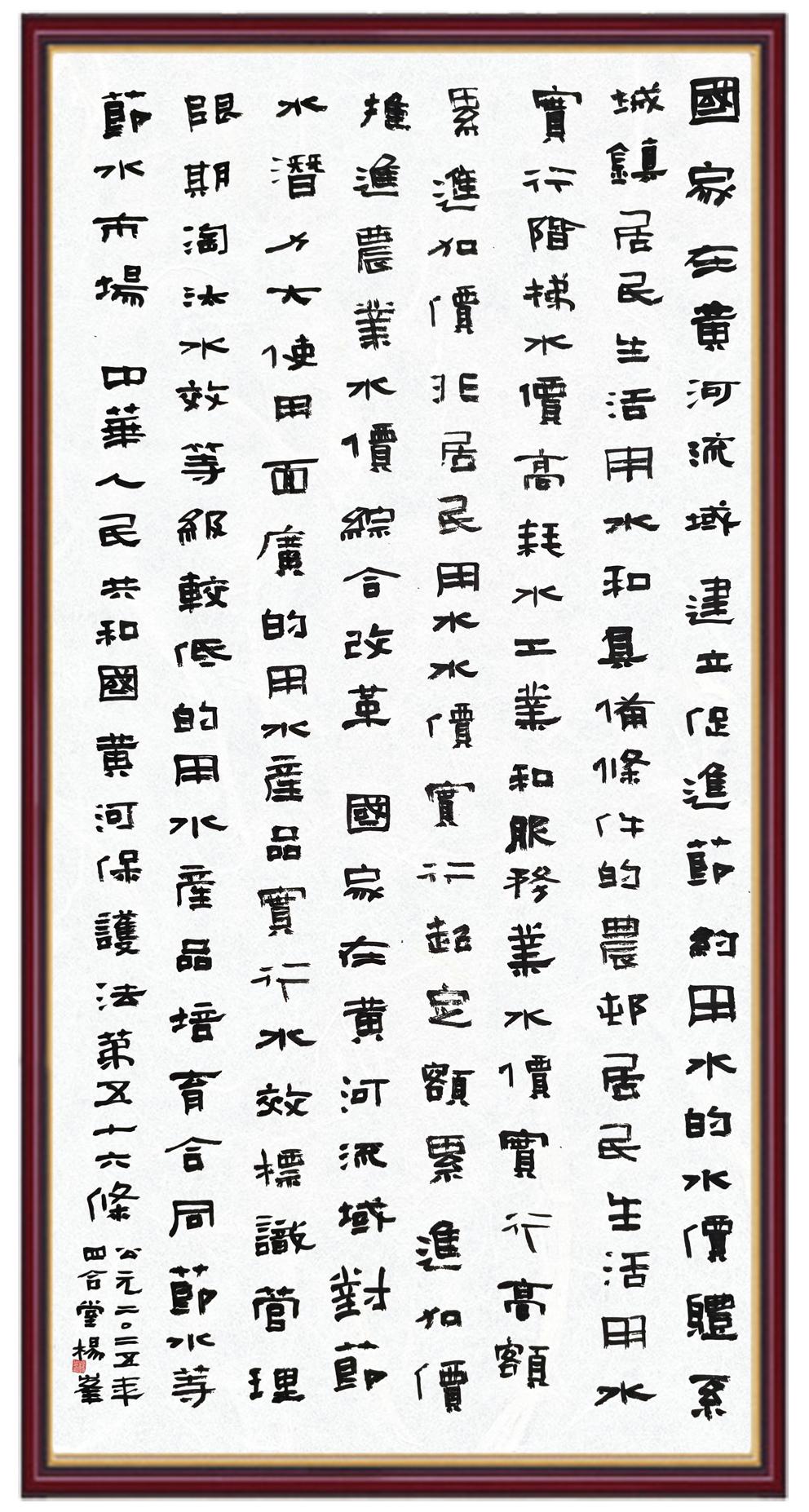 黃河寧,天下平。黃河是中華民族的發(fā)源地和搖籃,保護黃河是事關中華民族偉大復興的千秋大計?!吨腥A人民共和國黃河保護法》為推進水資源節(jié)約集約利用、保護傳承弘揚黃河文化、推動黃河流域生態(tài)保護和高質量發(fā)展提供了有力法治保障。繼書寫《中華人民共和國民法典》《中華人民共和國憲法》《中華人民共和國澳門特別行政區(qū)基本法》《中華人民共和國香港特別行政區(qū)基本法》《中華人民共和國國旗法》《中華人民共和國國徽法》《中華人民共和國國歌法》《中華人民共和國法官法》等法律法規(guī)之后,法制日報社聯(lián)合沿黃九?。▍^(qū))司法廳、書法家協(xié)會,將筆端對準《中華人民共和國黃河保護法》。