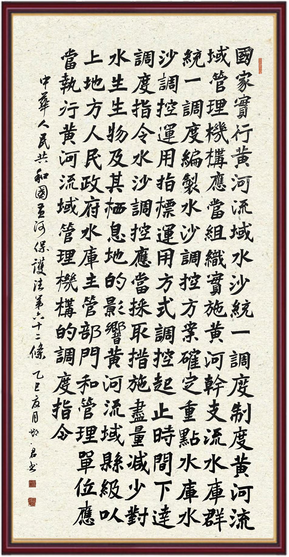 黃河寧,天下平。黃河是中華民族的發(fā)源地和搖籃,保護(hù)黃河是事關(guān)中華民族偉大復(fù)興的千秋大計(jì)?!吨腥A人民共和國黃河保護(hù)法》為推進(jìn)水資源節(jié)約集約利用、保護(hù)傳承弘揚(yáng)黃河文化、推動(dòng)黃河流域生態(tài)保護(hù)和高質(zhì)量發(fā)展提供了有力法治保障。繼書寫《中華人民共和國民法典》《中華人民共和國憲法》《中華人民共和國澳門特別行政區(qū)基本法》《中華人民共和國香港特別行政區(qū)基本法》《中華人民共和國國旗法》《中華人民共和國國徽法》《中華人民共和國國歌法》《中華人民共和國法官法》等法律法規(guī)之后,法制日報(bào)社聯(lián)合沿黃九省(區(qū))司法廳、書法家協(xié)會(huì),將筆端對準(zhǔn)《中華人民共和國黃河保護(hù)法》。