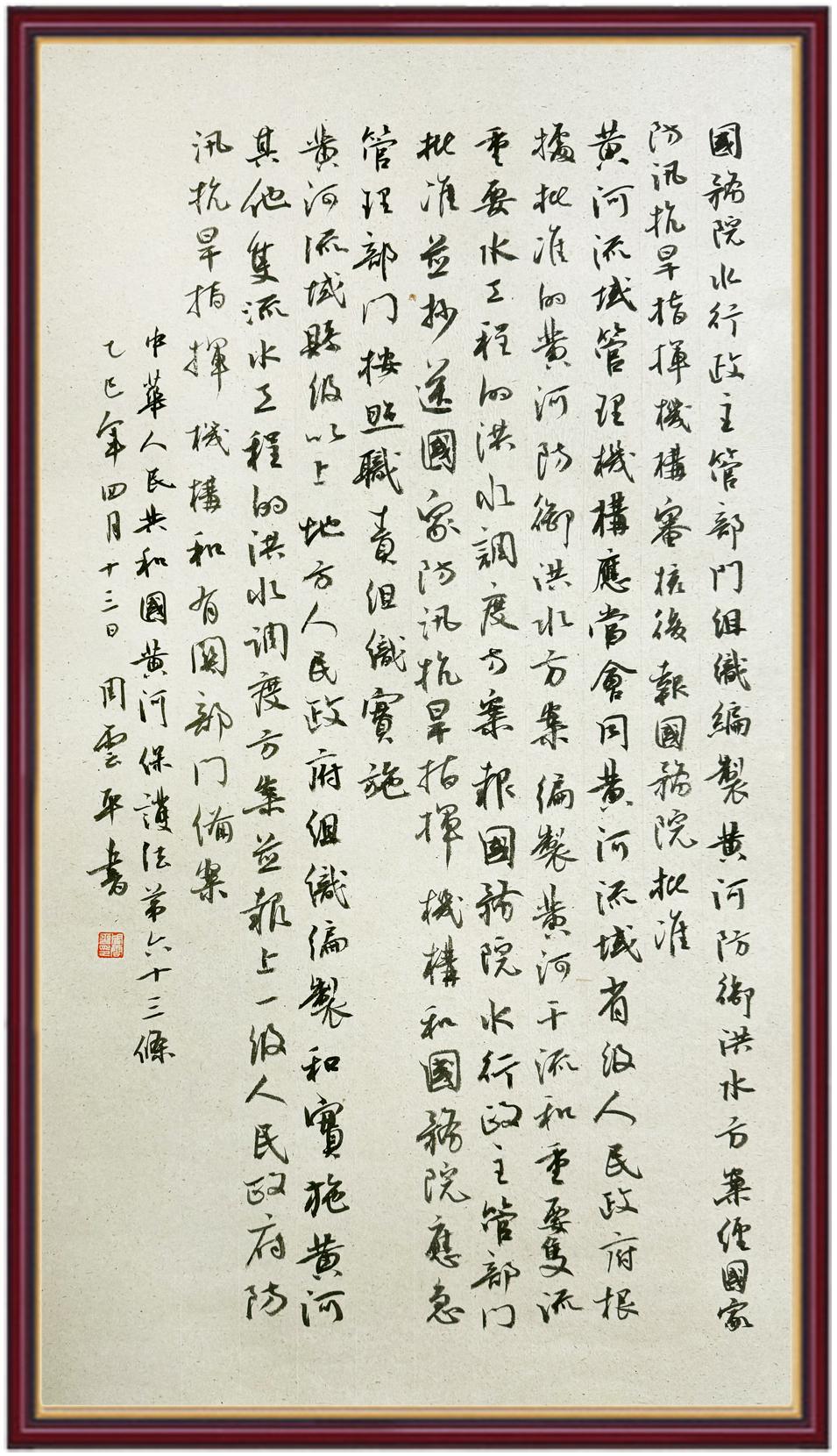 黃河寧,天下平。黃河是中華民族的發(fā)源地和搖籃,保護(hù)黃河是事關(guān)中華民族偉大復(fù)興的千秋大計(jì)?!吨腥A人民共和國黃河保護(hù)法》為推進(jìn)水資源節(jié)約集約利用、保護(hù)傳承弘揚(yáng)黃河文化、推動黃河流域生態(tài)保護(hù)和高質(zhì)量發(fā)展提供了有力法治保障。繼書寫《中華人民共和國民法典》《中華人民共和國憲法》《中華人民共和國澳門特別行政區(qū)基本法》《中華人民共和國香港特別行政區(qū)基本法》《中華人民共和國國旗法》《中華人民共和國國徽法》《中華人民共和國國歌法》《中華人民共和國法官法》等法律法規(guī)之后,法制日報(bào)社聯(lián)合沿黃九省(區(qū))司法廳、書法家協(xié)會,將筆端對準(zhǔn)《中華人民共和國黃河保護(hù)法》。