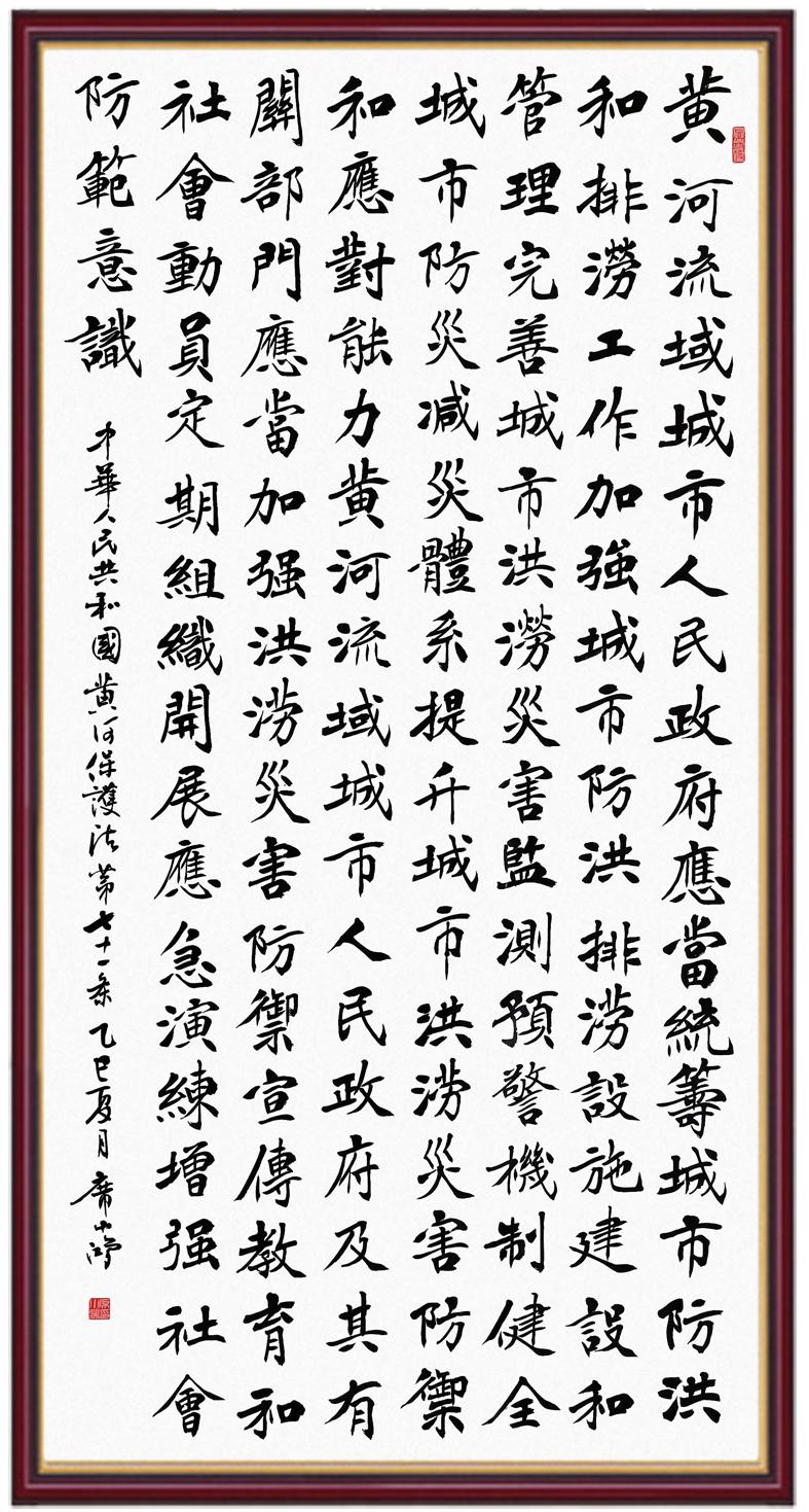 黃河寧,天下平。黃河是中華民族的發(fā)源地和搖籃,保護黃河是事關中華民族偉大復興的千秋大計。《中華人民共和國黃河保護法》為推進水資源節(jié)約集約利用、保護傳承弘揚黃河文化、推動黃河流域生態(tài)保護和高質(zhì)量發(fā)展提供了有力法治保障。繼書寫《中華人民共和國民法典》《中華人民共和國憲法》《中華人民共和國澳門特別行政區(qū)基本法》《中華人民共和國香港特別行政區(qū)基本法》《中華人民共和國國旗法》《中華人民共和國國徽法》《中華人民共和國國歌法》《中華人民共和國法官法》等法律法規(guī)之后,法制日報社聯(lián)合沿黃九?。▍^(qū))司法廳、書法家協(xié)會,將筆端對準《中華人民共和國黃河保護法》。