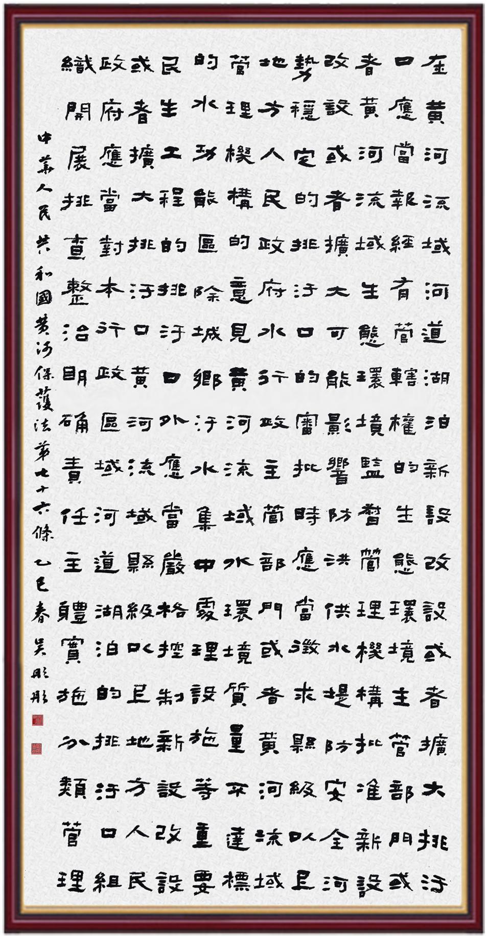 黃河寧,天下平。黃河是中華民族的發(fā)源地和搖籃,保護黃河是事關(guān)中華民族偉大復興的千秋大計?!吨腥A人民共和國黃河保護法》為推進水資源節(jié)約集約利用、保護傳承弘揚黃河文化、推動黃河流域生態(tài)保護和高質(zhì)量發(fā)展提供了有力法治保障。繼書寫《中華人民共和國民法典》《中華人民共和國憲法》《中華人民共和國澳門特別行政區(qū)基本法》《中華人民共和國香港特別行政區(qū)基本法》《中華人民共和國國旗法》《中華人民共和國國徽法》《中華人民共和國國歌法》《中華人民共和國法官法》等法律法規(guī)之后,法制日報社聯(lián)合沿黃九?。▍^(qū))司法廳、書法家協(xié)會,將筆端對準《中華人民共和國黃河保護法》。
