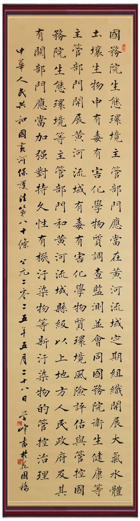 黃河寧,天下平。黃河是中華民族的發(fā)源地和搖籃,保護黃河是事關中華民族偉大復興的千秋大計?!吨腥A人民共和國黃河保護法》為推進水資源節(jié)約集約利用、保護傳承弘揚黃河文化、推動黃河流域生態(tài)保護和高質量發(fā)展提供了有力法治保障。繼書寫《中華人民共和國民法典》《中華人民共和國憲法》《中華人民共和國澳門特別行政區(qū)基本法》《中華人民共和國香港特別行政區(qū)基本法》《中華人民共和國國旗法》《中華人民共和國國徽法》《中華人民共和國國歌法》《中華人民共和國法官法》等法律法規(guī)之后,法制日報社聯合沿黃九?。▍^(qū))司法廳、書法家協(xié)會,將筆端對準《中華人民共和國黃河保護法》。