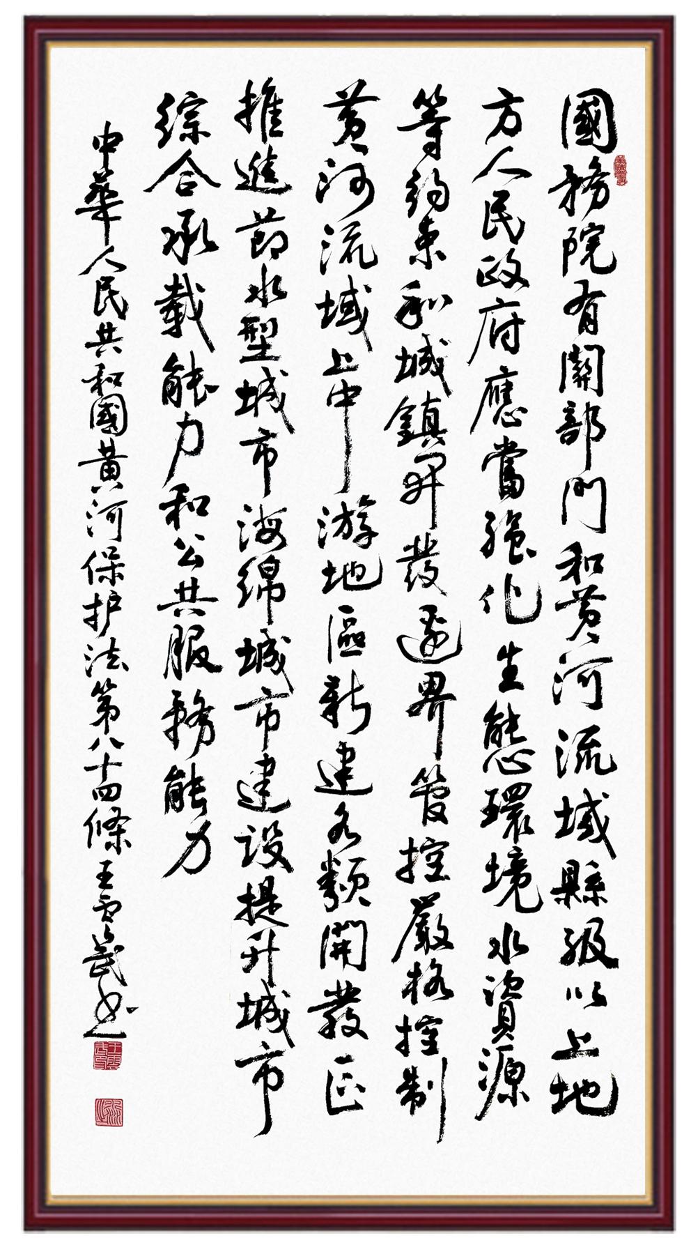 黃河寧,天下平。黃河是中華民族的發(fā)源地和搖籃,保護(hù)黃河是事關(guān)中華民族偉大復(fù)興的千秋大計(jì)。《中華人民共和國黃河保護(hù)法》為推進(jìn)水資源節(jié)約集約利用、保護(hù)傳承弘揚(yáng)黃河文化、推動黃河流域生態(tài)保護(hù)和高質(zhì)量發(fā)展提供了有力法治保障。繼書寫《中華人民共和國民法典》《中華人民共和國憲法》《中華人民共和國澳門特別行政區(qū)基本法》《中華人民共和國香港特別行政區(qū)基本法》《中華人民共和國國旗法》《中華人民共和國國徽法》《中華人民共和國國歌法》《中華人民共和國法官法》等法律法規(guī)之后,法制日報社聯(lián)合沿黃九省(區(qū))司法廳、書法家協(xié)會,將筆端對準(zhǔn)《中華人民共和國黃河保護(hù)法》。
