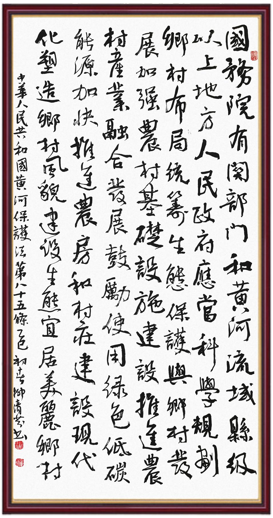 黃河寧,天下平。黃河是中華民族的發(fā)源地和搖籃,保護(hù)黃河是事關(guān)中華民族偉大復(fù)興的千秋大計(jì)?!吨腥A人民共和國(guó)黃河保護(hù)法》為推進(jìn)水資源節(jié)約集約利用、保護(hù)傳承弘揚(yáng)黃河文化、推動(dòng)黃河流域生態(tài)保護(hù)和高質(zhì)量發(fā)展提供了有力法治保障。繼書(shū)寫(xiě)《中華人民共和國(guó)民法典》《中華人民共和國(guó)憲法》《中華人民共和國(guó)澳門(mén)特別行政區(qū)基本法》《中華人民共和國(guó)香港特別行政區(qū)基本法》《中華人民共和國(guó)國(guó)旗法》《中華人民共和國(guó)國(guó)徽法》《中華人民共和國(guó)國(guó)歌法》《中華人民共和國(guó)法官法》等法律法規(guī)之后,法制日?qǐng)?bào)社聯(lián)合沿黃九?。▍^(qū))司法廳、書(shū)法家協(xié)會(huì),將筆端對(duì)準(zhǔn)《中華人民共和國(guó)黃河保護(hù)法》。