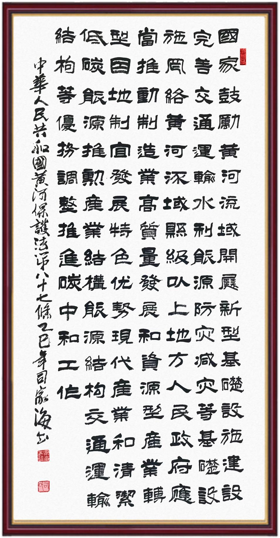 黃河寧,天下平。黃河是中華民族的發(fā)源地和搖籃,保護黃河是事關中華民族偉大復興的千秋大計?!吨腥A人民共和國黃河保護法》為推進水資源節(jié)約集約利用、保護傳承弘揚黃河文化、推動黃河流域生態(tài)保護和高質量發(fā)展提供了有力法治保障。繼書寫《中華人民共和國民法典》《中華人民共和國憲法》《中華人民共和國澳門特別行政區(qū)基本法》《中華人民共和國香港特別行政區(qū)基本法》《中華人民共和國國旗法》《中華人民共和國國徽法》《中華人民共和國國歌法》《中華人民共和國法官法》等法律法規(guī)之后,法制日報社聯合沿黃九省(區(qū))司法廳、書法家協會,將筆端對準《中華人民共和國黃河保護法》。