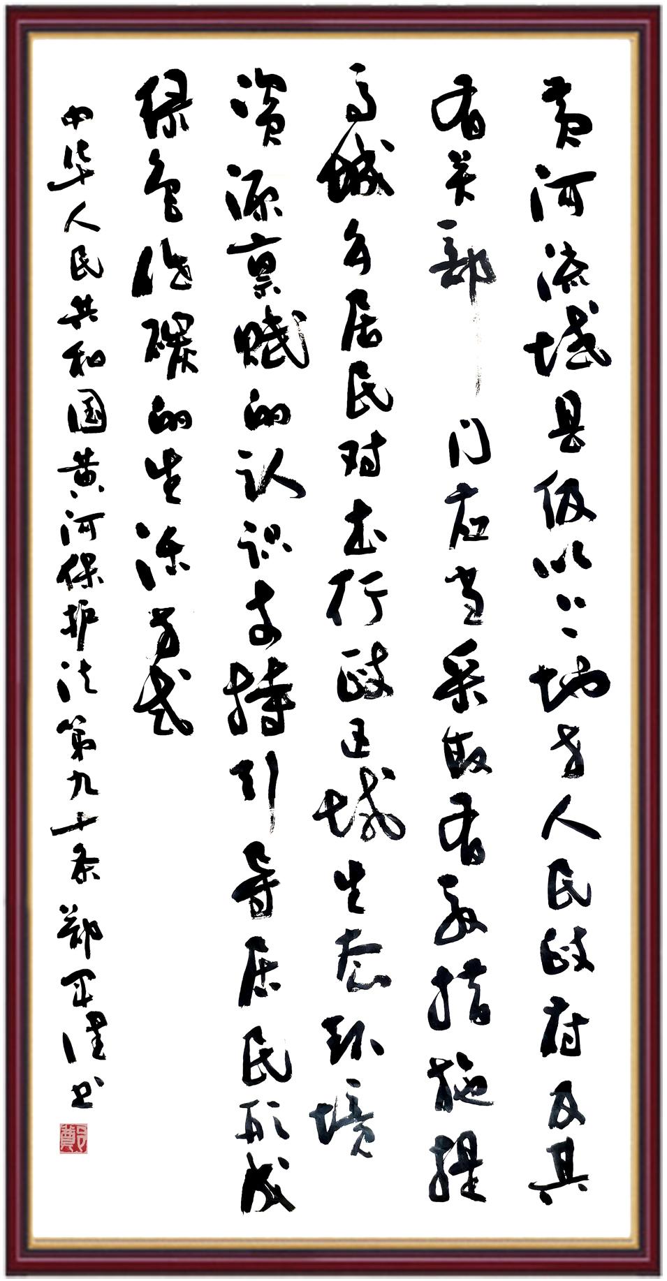 黃河寧,天下平。黃河是中華民族的發(fā)源地和搖籃,保護(hù)黃河是事關(guān)中華民族偉大復(fù)興的千秋大計(jì)?!吨腥A人民共和國(guó)黃河保護(hù)法》為推進(jìn)水資源節(jié)約集約利用、保護(hù)傳承弘揚(yáng)黃河文化、推動(dòng)黃河流域生態(tài)保護(hù)和高質(zhì)量發(fā)展提供了有力法治保障。繼書(shū)寫(xiě)《中華人民共和國(guó)民法典》《中華人民共和國(guó)憲法》《中華人民共和國(guó)澳門(mén)特別行政區(qū)基本法》《中華人民共和國(guó)香港特別行政區(qū)基本法》《中華人民共和國(guó)國(guó)旗法》《中華人民共和國(guó)國(guó)徽法》《中華人民共和國(guó)國(guó)歌法》《中華人民共和國(guó)法官法》等法律法規(guī)之后,法制日?qǐng)?bào)社聯(lián)合沿黃九省(區(qū))司法廳、書(shū)法家協(xié)會(huì),將筆端對(duì)準(zhǔn)《中華人民共和國(guó)黃河保護(hù)法》。