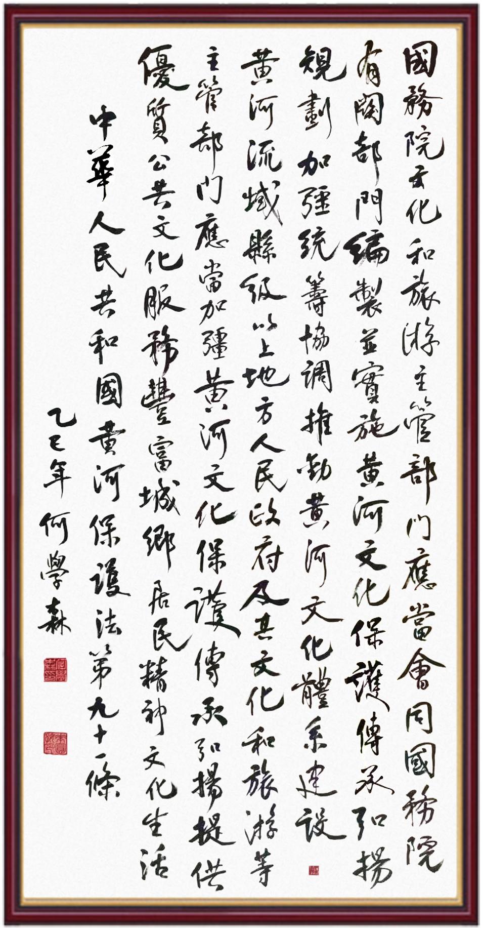 黃河寧,天下平。黃河是中華民族的發(fā)源地和搖籃,保護(hù)黃河是事關(guān)中華民族偉大復(fù)興的千秋大計(jì)?!吨腥A人民共和國(guó)黃河保護(hù)法》為推進(jìn)水資源節(jié)約集約利用、保護(hù)傳承弘揚(yáng)黃河文化、推動(dòng)黃河流域生態(tài)保護(hù)和高質(zhì)量發(fā)展提供了有力法治保障。繼書寫《中華人民共和國(guó)民法典》《中華人民共和國(guó)憲法》《中華人民共和國(guó)澳門特別行政區(qū)基本法》《中華人民共和國(guó)香港特別行政區(qū)基本法》《中華人民共和國(guó)國(guó)旗法》《中華人民共和國(guó)國(guó)徽法》《中華人民共和國(guó)國(guó)歌法》《中華人民共和國(guó)法官法》等法律法規(guī)之后,法制日?qǐng)?bào)社聯(lián)合沿黃九省(區(qū))司法廳、書法家協(xié)會(huì),將筆端對(duì)準(zhǔn)《中華人民共和國(guó)黃河保護(hù)法》。