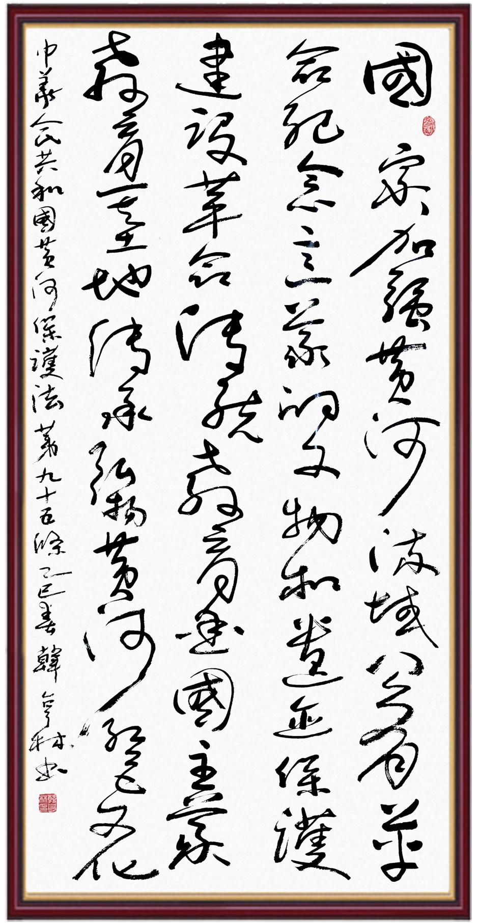 黃河寧,天下平。黃河是中華民族的發(fā)源地和搖籃,保護(hù)黃河是事關(guān)中華民族偉大復(fù)興的千秋大計(jì)。《中華人民共和國(guó)黃河保護(hù)法》為推進(jìn)水資源節(jié)約集約利用、保護(hù)傳承弘揚(yáng)黃河文化、推動(dòng)黃河流域生態(tài)保護(hù)和高質(zhì)量發(fā)展提供了有力法治保障。繼書(shū)寫《中華人民共和國(guó)民法典》《中華人民共和國(guó)憲法》《中華人民共和國(guó)澳門特別行政區(qū)基本法》《中華人民共和國(guó)香港特別行政區(qū)基本法》《中華人民共和國(guó)國(guó)旗法》《中華人民共和國(guó)國(guó)徽法》《中華人民共和國(guó)國(guó)歌法》《中華人民共和國(guó)法官法》等法律法規(guī)之后,法制日?qǐng)?bào)社聯(lián)合沿黃九省(區(qū))司法廳、書(shū)法家協(xié)會(huì),將筆端對(duì)準(zhǔn)《中華人民共和國(guó)黃河保護(hù)法》。