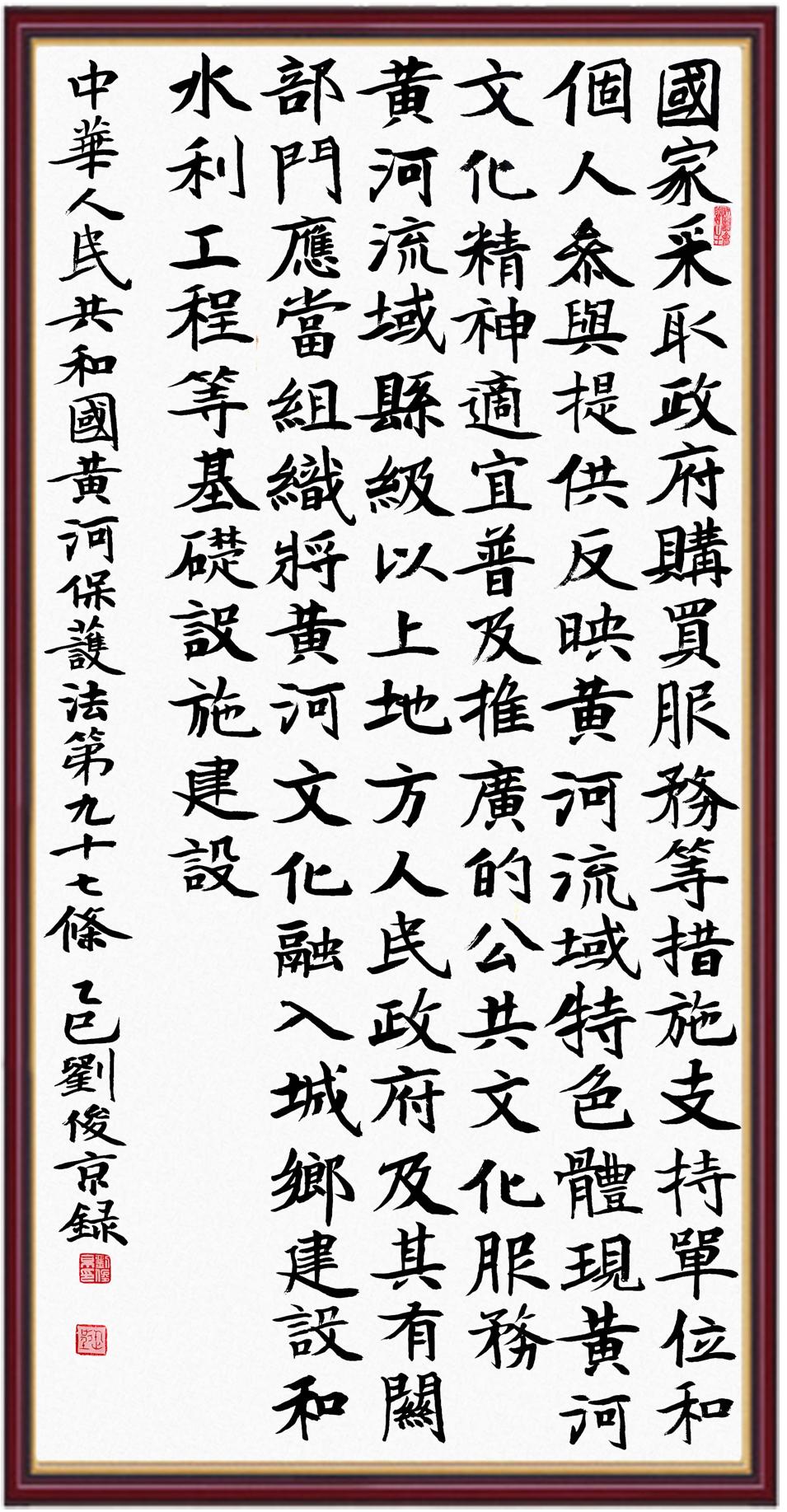 黃河寧,天下平。黃河是中華民族的發(fā)源地和搖籃,保護(hù)黃河是事關(guān)中華民族偉大復(fù)興的千秋大計(jì)?!吨腥A人民共和國(guó)黃河保護(hù)法》為推進(jìn)水資源節(jié)約集約利用、保護(hù)傳承弘揚(yáng)黃河文化、推動(dòng)黃河流域生態(tài)保護(hù)和高質(zhì)量發(fā)展提供了有力法治保障。繼書寫《中華人民共和國(guó)民法典》《中華人民共和國(guó)憲法》《中華人民共和國(guó)澳門特別行政區(qū)基本法》《中華人民共和國(guó)香港特別行政區(qū)基本法》《中華人民共和國(guó)國(guó)旗法》《中華人民共和國(guó)國(guó)徽法》《中華人民共和國(guó)國(guó)歌法》《中華人民共和國(guó)法官法》等法律法規(guī)之后,法制日?qǐng)?bào)社聯(lián)合沿黃九省(區(qū))司法廳、書法家協(xié)會(huì),將筆端對(duì)準(zhǔn)《中華人民共和國(guó)黃河保護(hù)法》。