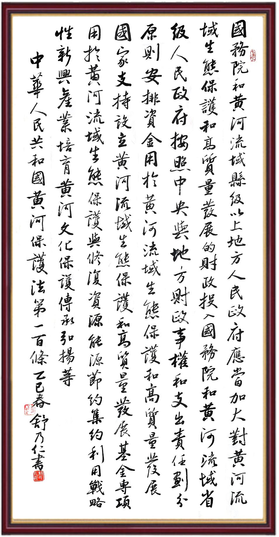 黃河寧,天下平。黃河是中華民族的發(fā)源地和搖籃,保護(hù)黃河是事關(guān)中華民族偉大復(fù)興的千秋大計(jì)?!吨腥A人民共和國(guó)黃河保護(hù)法》為推進(jìn)水資源節(jié)約集約利用、保護(hù)傳承弘揚(yáng)黃河文化、推動(dòng)黃河流域生態(tài)保護(hù)和高質(zhì)量發(fā)展提供了有力法治保障。繼書(shū)寫(xiě)《中華人民共和國(guó)民法典》《中華人民共和國(guó)憲法》《中華人民共和國(guó)澳門(mén)特別行政區(qū)基本法》《中華人民共和國(guó)香港特別行政區(qū)基本法》《中華人民共和國(guó)國(guó)旗法》《中華人民共和國(guó)國(guó)徽法》《中華人民共和國(guó)國(guó)歌法》《中華人民共和國(guó)法官法》等法律法規(guī)之后,法制日?qǐng)?bào)社聯(lián)合沿黃九?。▍^(qū))司法廳、書(shū)法家協(xié)會(huì),將筆端對(duì)準(zhǔn)《中華人民共和國(guó)黃河保護(hù)法》。