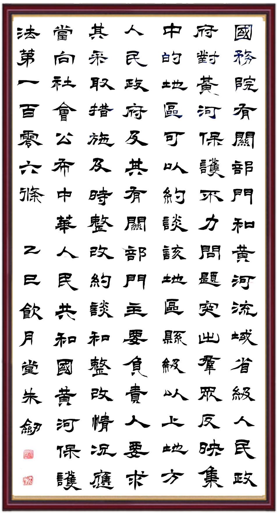黃河寧,天下平。黃河是中華民族的發(fā)源地和搖籃,保護(hù)黃河是事關(guān)中華民族偉大復(fù)興的千秋大計(jì)?!吨腥A人民共和國(guó)黃河保護(hù)法》為推進(jìn)水資源節(jié)約集約利用、保護(hù)傳承弘揚(yáng)黃河文化、推動(dòng)黃河流域生態(tài)保護(hù)和高質(zhì)量發(fā)展提供了有力法治保障。繼書寫《中華人民共和國(guó)民法典》《中華人民共和國(guó)憲法》《中華人民共和國(guó)澳門特別行政區(qū)基本法》《中華人民共和國(guó)香港特別行政區(qū)基本法》《中華人民共和國(guó)國(guó)旗法》《中華人民共和國(guó)國(guó)徽法》《中華人民共和國(guó)國(guó)歌法》《中華人民共和國(guó)法官法》等法律法規(guī)之后,法制日?qǐng)?bào)社聯(lián)合沿黃九?。▍^(qū))司法廳、書法家協(xié)會(huì),將筆端對(duì)準(zhǔn)《中華人民共和國(guó)黃河保護(hù)法》。