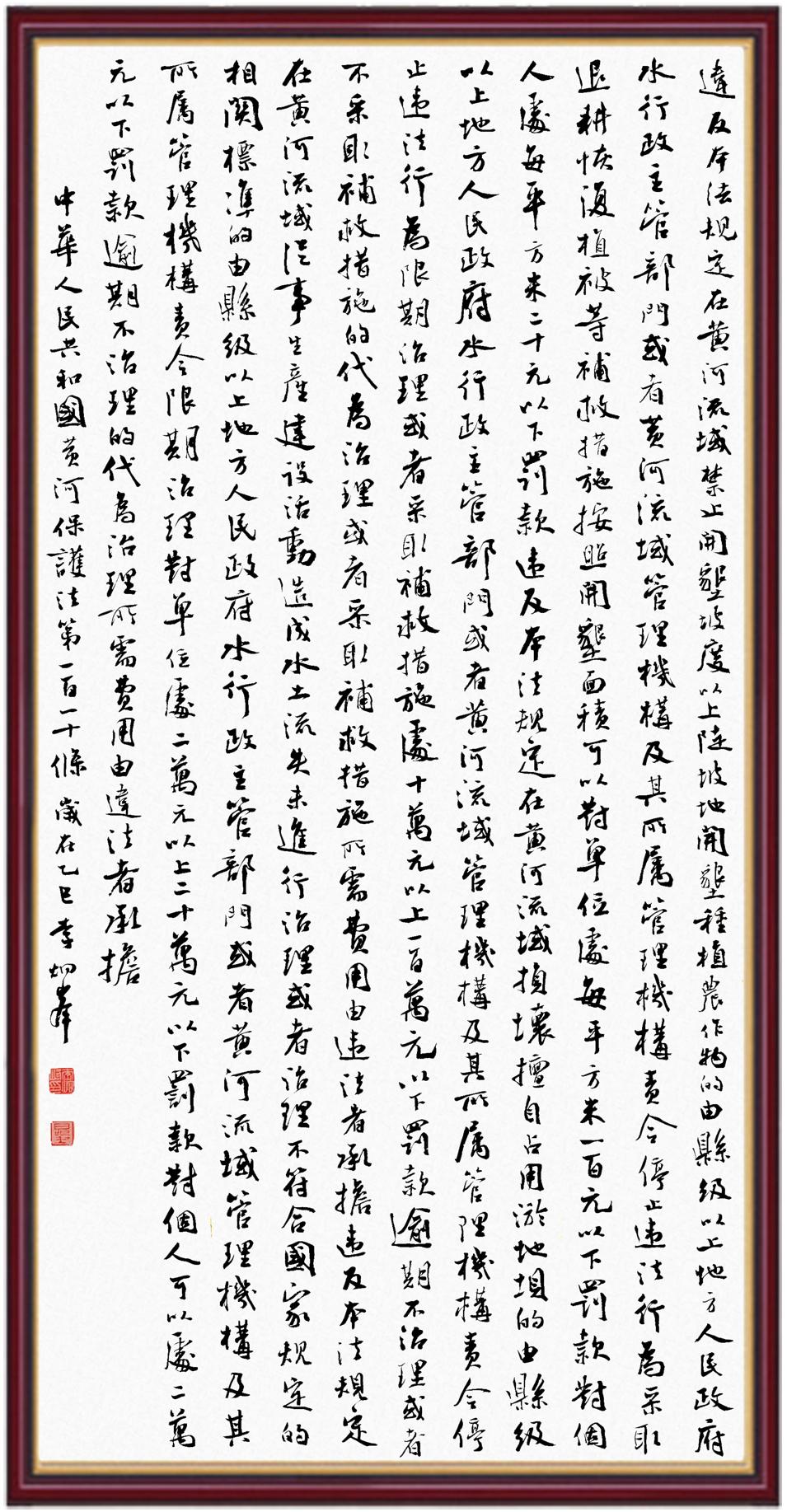 黃河寧,天下平。黃河是中華民族的發(fā)源地和搖籃,保護黃河是事關(guān)中華民族偉大復(fù)興的千秋大計?!吨腥A人民共和國黃河保護法》為推進水資源節(jié)約集約利用、保護傳承弘揚黃河文化、推動黃河流域生態(tài)保護和高質(zhì)量發(fā)展提供了有力法治保障。繼書寫《中華人民共和國民法典》《中華人民共和國憲法》《中華人民共和國澳門特別行政區(qū)基本法》《中華人民共和國香港特別行政區(qū)基本法》《中華人民共和國國旗法》《中華人民共和國國徽法》《中華人民共和國國歌法》《中華人民共和國法官法》等法律法規(guī)之后,法制日報社聯(lián)合沿黃九省(區(qū))司法廳、書法家協(xié)會,將筆端對準《中華人民共和國黃河保護法》。