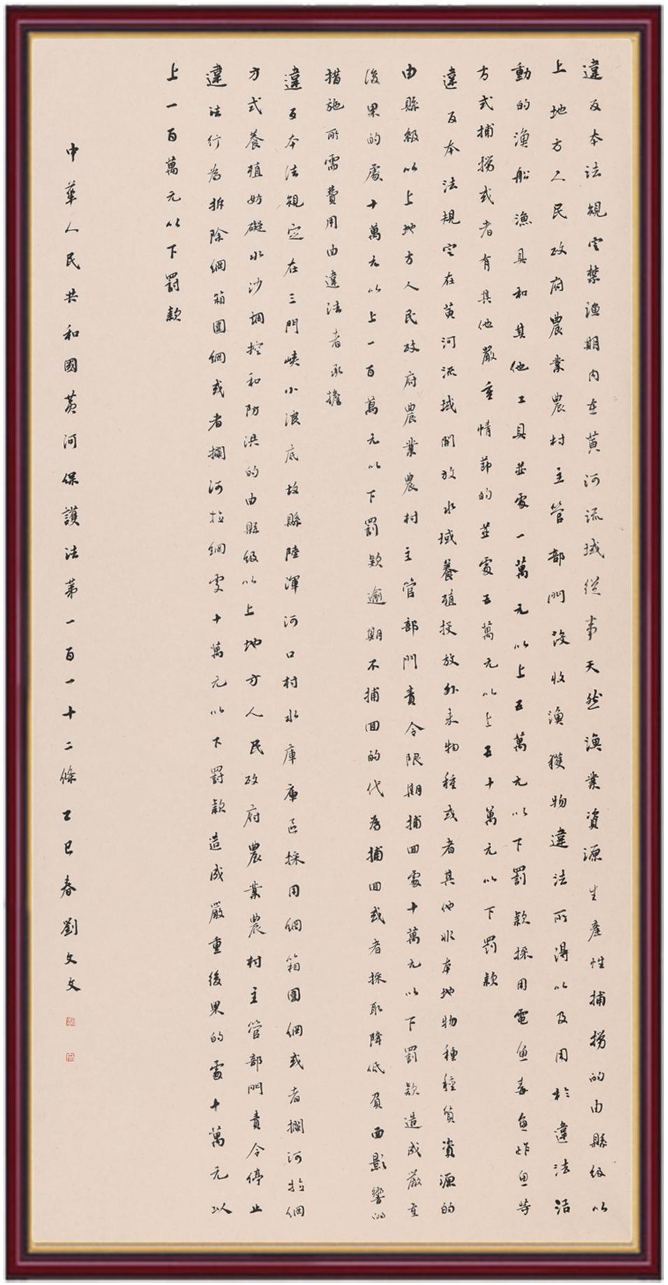 黃河寧,天下平。黃河是中華民族的發(fā)源地和搖籃,保護(hù)黃河是事關(guān)中華民族偉大復(fù)興的千秋大計(jì)。《中華人民共和國(guó)黃河保護(hù)法》為推進(jìn)水資源節(jié)約集約利用、保護(hù)傳承弘揚(yáng)黃河文化、推動(dòng)黃河流域生態(tài)保護(hù)和高質(zhì)量發(fā)展提供了有力法治保障。繼書(shū)寫(xiě)《中華人民共和國(guó)民法典》《中華人民共和國(guó)憲法》《中華人民共和國(guó)澳門(mén)特別行政區(qū)基本法》《中華人民共和國(guó)香港特別行政區(qū)基本法》《中華人民共和國(guó)國(guó)旗法》《中華人民共和國(guó)國(guó)徽法》《中華人民共和國(guó)國(guó)歌法》《中華人民共和國(guó)法官法》等法律法規(guī)之后,法制日?qǐng)?bào)社聯(lián)合沿黃九?。▍^(qū))司法廳、書(shū)法家協(xié)會(huì),將筆端對(duì)準(zhǔn)《中華人民共和國(guó)黃河保護(hù)法》。