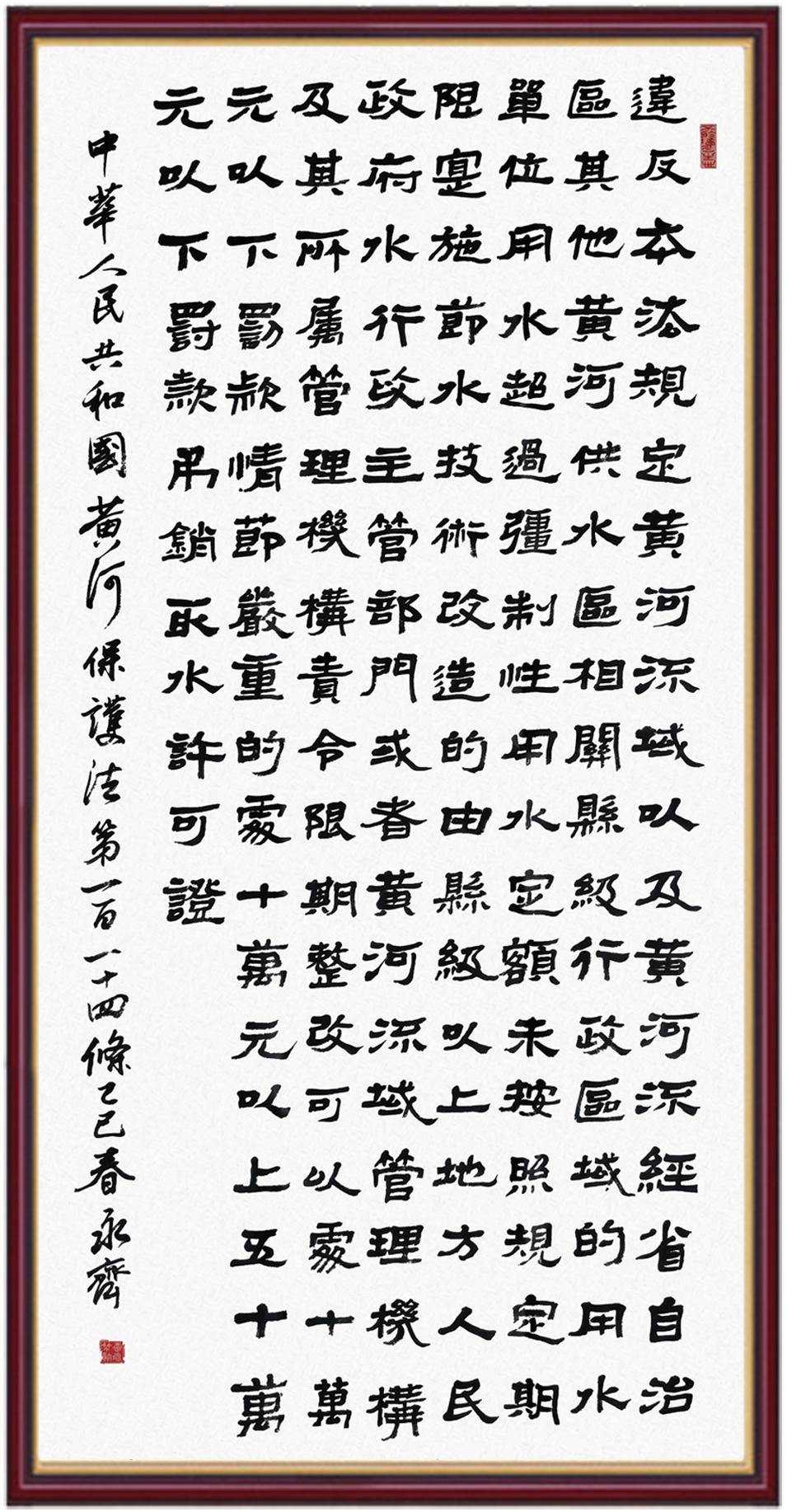 黃河寧,天下平。黃河是中華民族的發(fā)源地和搖籃,保護(hù)黃河是事關(guān)中華民族偉大復(fù)興的千秋大計(jì)?!吨腥A人民共和國黃河保護(hù)法》為推進(jìn)水資源節(jié)約集約利用、保護(hù)傳承弘揚(yáng)黃河文化、推動(dòng)黃河流域生態(tài)保護(hù)和高質(zhì)量發(fā)展提供了有力法治保障。繼書寫《中華人民共和國民法典》《中華人民共和國憲法》《中華人民共和國澳門特別行政區(qū)基本法》《中華人民共和國香港特別行政區(qū)基本法》《中華人民共和國國旗法》《中華人民共和國國徽法》《中華人民共和國國歌法》《中華人民共和國法官法》等法律法規(guī)之后,法制日?qǐng)?bào)社聯(lián)合沿黃九?。▍^(qū))司法廳、書法家協(xié)會(huì),將筆端對(duì)準(zhǔn)《中華人民共和國黃河保護(hù)法》。