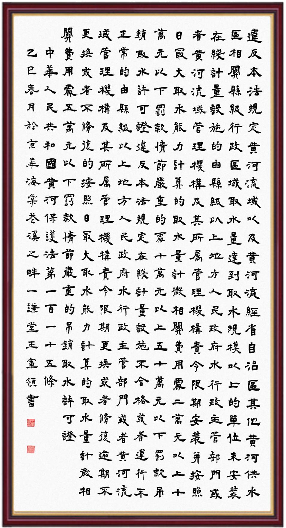 黃河寧,天下平。黃河是中華民族的發(fā)源地和搖籃,保護黃河是事關(guān)中華民族偉大復(fù)興的千秋大計?!吨腥A人民共和國黃河保護法》為推進水資源節(jié)約集約利用、保護傳承弘揚黃河文化、推動黃河流域生態(tài)保護和高質(zhì)量發(fā)展提供了有力法治保障。繼書寫《中華人民共和國民法典》《中華人民共和國憲法》《中華人民共和國澳門特別行政區(qū)基本法》《中華人民共和國香港特別行政區(qū)基本法》《中華人民共和國國旗法》《中華人民共和國國徽法》《中華人民共和國國歌法》《中華人民共和國法官法》等法律法規(guī)之后,法制日報社聯(lián)合沿黃九省(區(qū))司法廳、書法家協(xié)會,將筆端對準《中華人民共和國黃河保護法》。