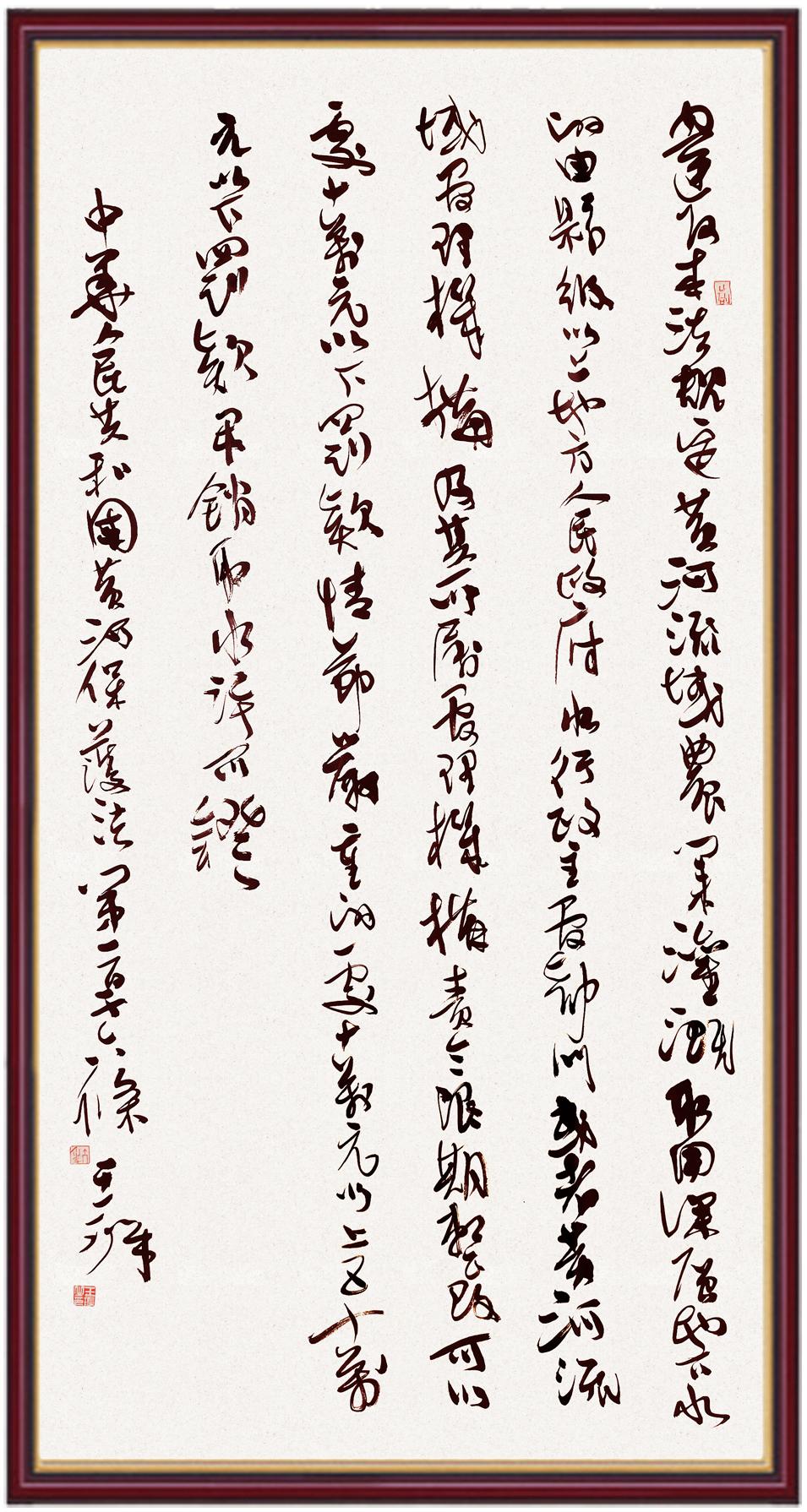 黃河寧,天下平。黃河是中華民族的發(fā)源地和搖籃,保護(hù)黃河是事關(guān)中華民族偉大復(fù)興的千秋大計(jì)。《中華人民共和國黃河保護(hù)法》為推進(jìn)水資源節(jié)約集約利用、保護(hù)傳承弘揚(yáng)黃河文化、推動(dòng)黃河流域生態(tài)保護(hù)和高質(zhì)量發(fā)展提供了有力法治保障。繼書寫《中華人民共和國民法典》《中華人民共和國憲法》《中華人民共和國澳門特別行政區(qū)基本法》《中華人民共和國香港特別行政區(qū)基本法》《中華人民共和國國旗法》《中華人民共和國國徽法》《中華人民共和國國歌法》《中華人民共和國法官法》等法律法規(guī)之后,法制日?qǐng)?bào)社聯(lián)合沿黃九?。▍^(qū))司法廳、書法家協(xié)會(huì),將筆端對(duì)準(zhǔn)《中華人民共和國黃河保護(hù)法》。