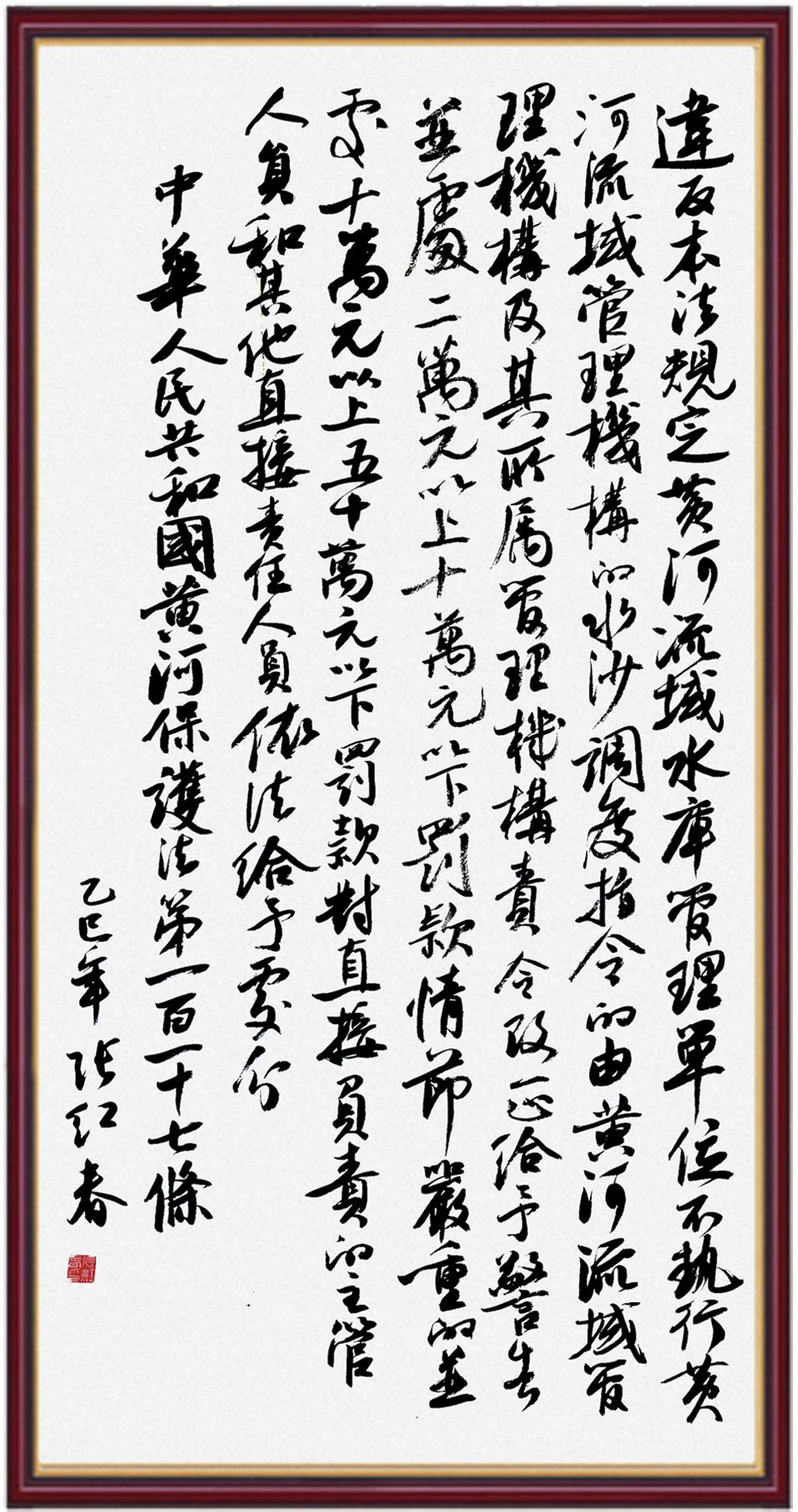 黃河寧,天下平。黃河是中華民族的發(fā)源地和搖籃,保護(hù)黃河是事關(guān)中華民族偉大復(fù)興的千秋大計(jì)?!吨腥A人民共和國黃河保護(hù)法》為推進(jìn)水資源節(jié)約集約利用、保護(hù)傳承弘揚(yáng)黃河文化、推動(dòng)黃河流域生態(tài)保護(hù)和高質(zhì)量發(fā)展提供了有力法治保障。繼書寫《中華人民共和國民法典》《中華人民共和國憲法》《中華人民共和國澳門特別行政區(qū)基本法》《中華人民共和國香港特別行政區(qū)基本法》《中華人民共和國國旗法》《中華人民共和國國徽法》《中華人民共和國國歌法》《中華人民共和國法官法》等法律法規(guī)之后,法制日報(bào)社聯(lián)合沿黃九?。▍^(qū))司法廳、書法家協(xié)會(huì),將筆端對準(zhǔn)《中華人民共和國黃河保護(hù)法》。