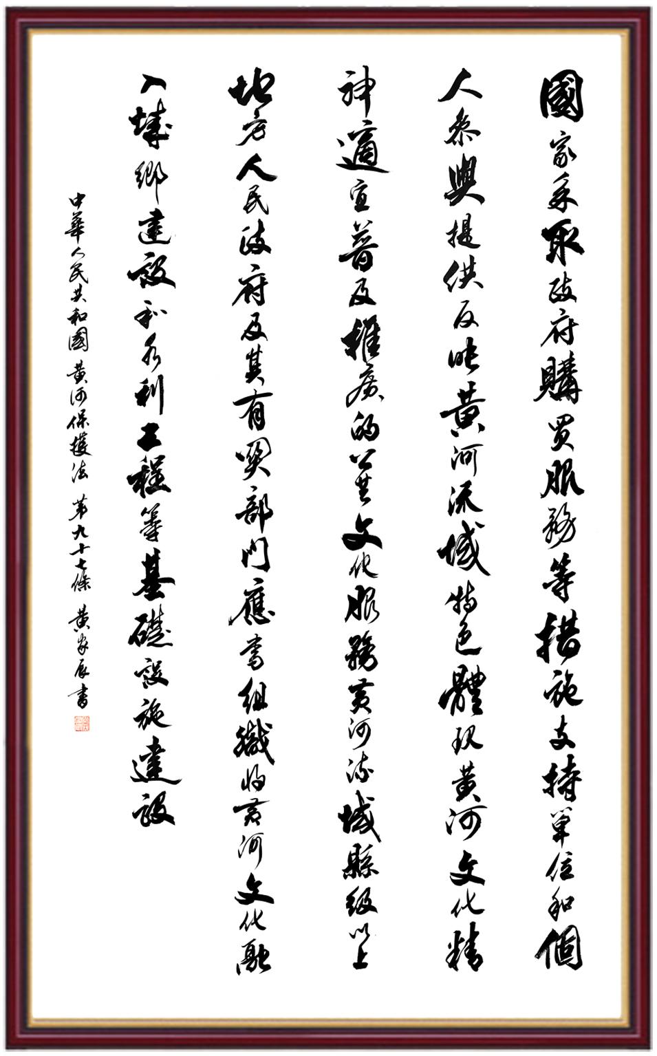 黃河寧,天下平。黃河是中華民族的發(fā)源地和搖籃,保護(hù)黃河是事關(guān)中華民族偉大復(fù)興的千秋大計(jì)?!吨腥A人民共和國黃河保護(hù)法》為推進(jìn)水資源節(jié)約集約利用、保護(hù)傳承弘揚(yáng)黃河文化、推動黃河流域生態(tài)保護(hù)和高質(zhì)量發(fā)展提供了有力法治保障。繼書寫《中華人民共和國民法典》《中華人民共和國憲法》《中華人民共和國澳門特別行政區(qū)基本法》《中華人民共和國香港特別行政區(qū)基本法》《中華人民共和國國旗法》《中華人民共和國國徽法》《中華人民共和國國歌法》《中華人民共和國法官法》等法律法規(guī)之后,法制日報(bào)社聯(lián)合沿黃九?。▍^(qū))司法廳、書法家協(xié)會,將筆端對準(zhǔn)《中華人民共和國黃河保護(hù)法》。