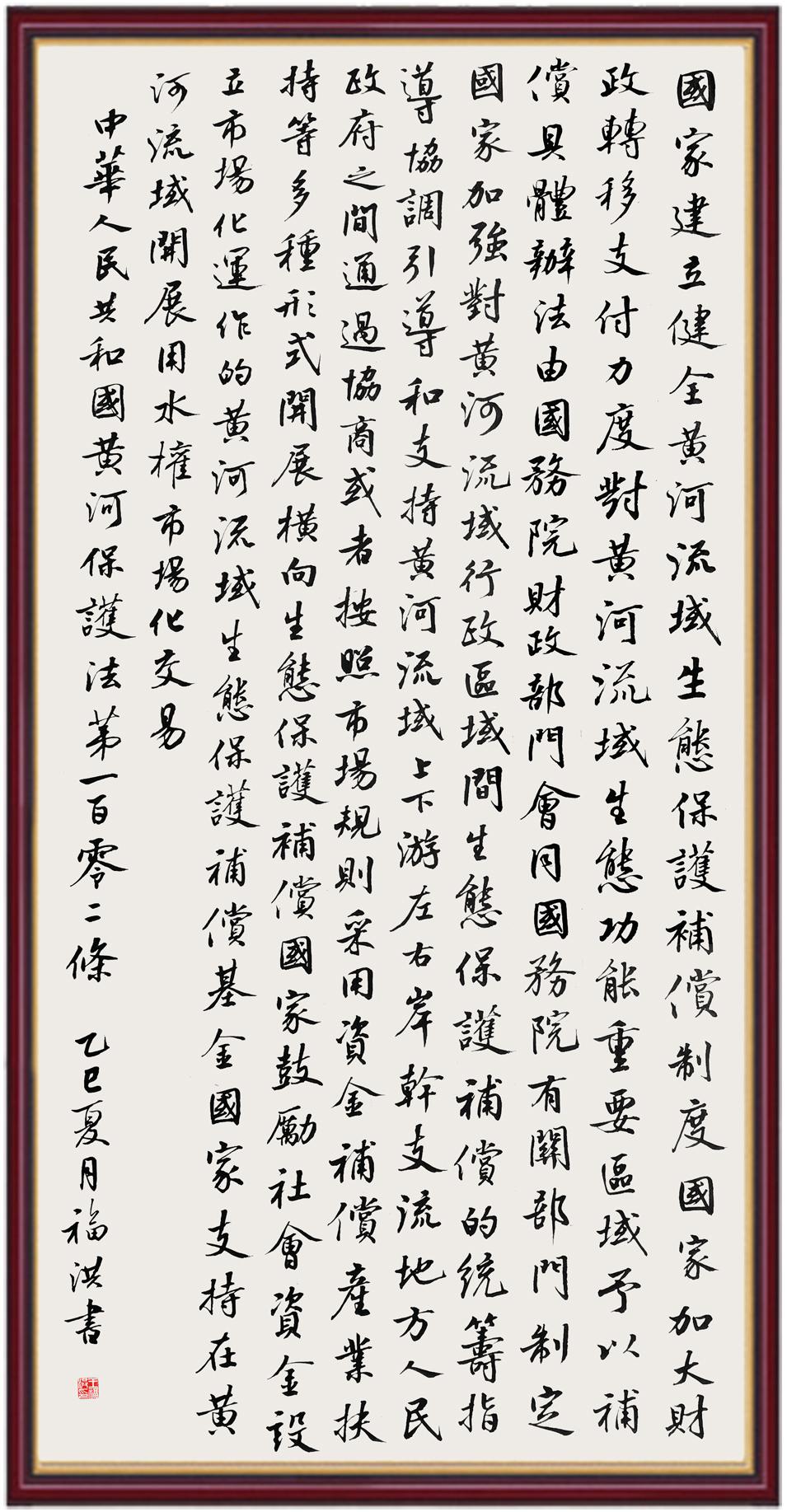 黃河寧,天下平。黃河是中華民族的發(fā)源地和搖籃,保護(hù)黃河是事關(guān)中華民族偉大復(fù)興的千秋大計(jì)。《中華人民共和國(guó)黃河保護(hù)法》為推進(jìn)水資源節(jié)約集約利用、保護(hù)傳承弘揚(yáng)黃河文化、推動(dòng)黃河流域生態(tài)保護(hù)和高質(zhì)量發(fā)展提供了有力法治保障。繼書(shū)寫(xiě)《中華人民共和國(guó)民法典》《中華人民共和國(guó)憲法》《中華人民共和國(guó)澳門(mén)特別行政區(qū)基本法》《中華人民共和國(guó)香港特別行政區(qū)基本法》《中華人民共和國(guó)國(guó)旗法》《中華人民共和國(guó)國(guó)徽法》《中華人民共和國(guó)國(guó)歌法》《中華人民共和國(guó)法官法》等法律法規(guī)之后,法制日?qǐng)?bào)社聯(lián)合沿黃九?。▍^(qū))司法廳、書(shū)法家協(xié)會(huì),將筆端對(duì)準(zhǔn)《中華人民共和國(guó)黃河保護(hù)法》。