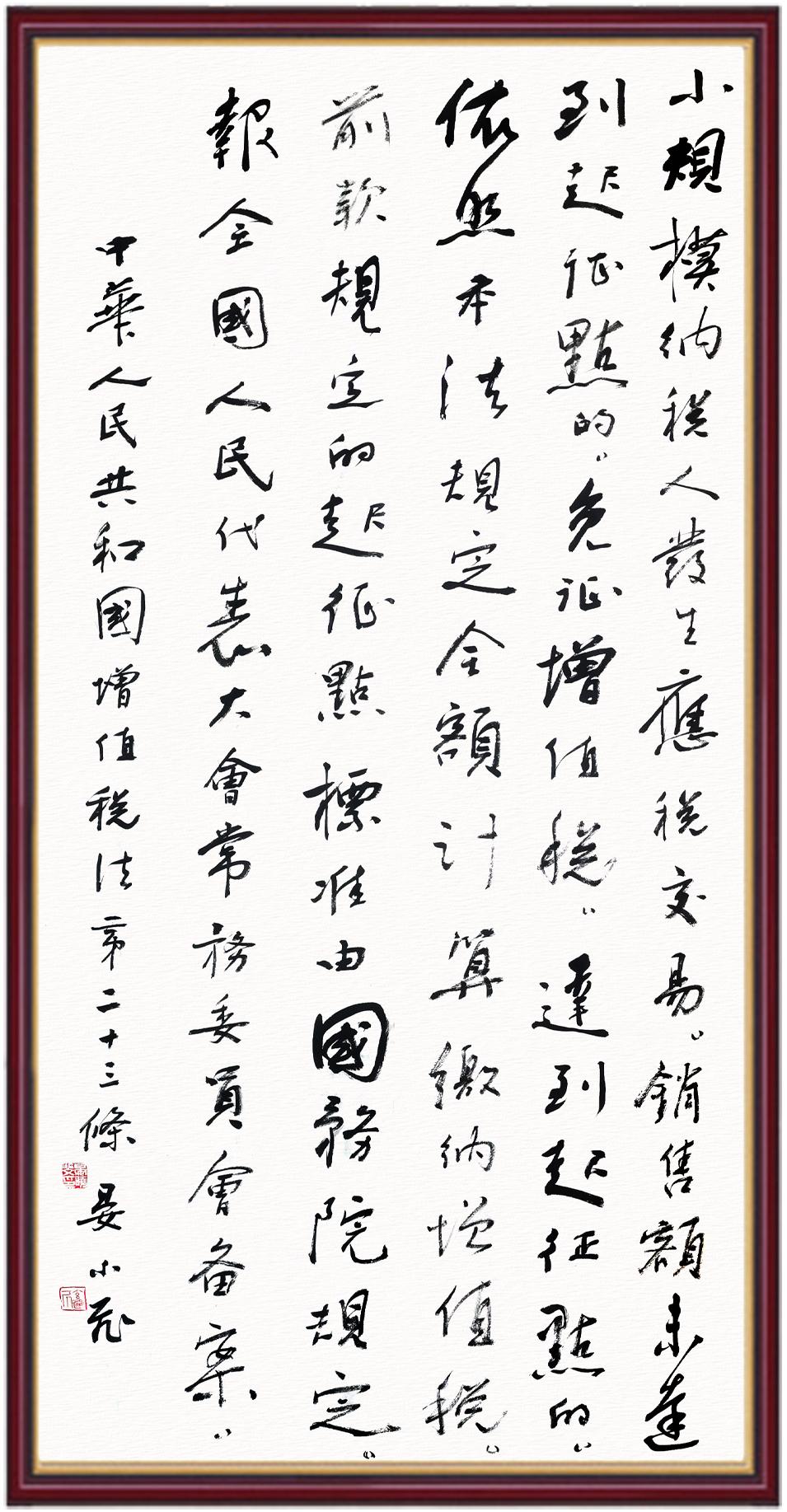 稅收一頭連著國計,一頭連著民生。全面推進依法治稅,是全面依法治國基本方略在稅收領(lǐng)域的集中體現(xiàn)。《中華人民共和國增值稅法》將于2026年1月1日起施行,對全面落實稅收法定原則、健全有利于高質(zhì)量發(fā)展的增值稅制度、規(guī)范增值稅的征收和繳納、保護納稅人合法權(quán)益具有重要意義。繼書寫《中華人民共和國民法典》《中華人民共和國憲法》《中華人民共和國國旗法》《中華人民共和國國徽法》《中華人民共和國國歌法》《中華人民共和國法官法》《中華人民共和國黃河保護法》等法律法規(guī)之后,法制日報社將筆端對準《中華人民共和國增值稅法》。