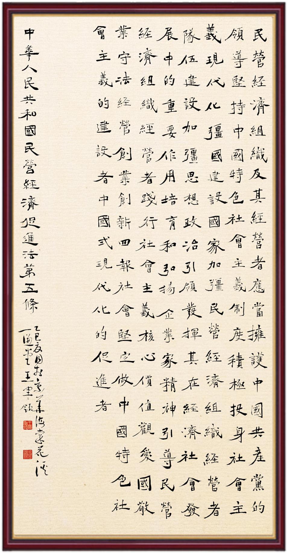 《中華人民共和國民營經(jīng)濟(jì)促進(jìn)法》自今年5月20日起施行。作為我國首部專門關(guān)于民營經(jīng)濟(jì)發(fā)展的基礎(chǔ)性法律,民營經(jīng)濟(jì)促進(jìn)法將支持和保障民營經(jīng)濟(jì)發(fā)展的法律制度融入中國特色社會主義法律體系,具有重大的法治意義,為促進(jìn)民營經(jīng)濟(jì)持續(xù)、健康、高質(zhì)量發(fā)展提供了堅實(shí)的法治保障。為更好地學(xué)習(xí)、宣傳、貫徹這部法律,法治日報社聯(lián)合司法部普法與依法治理局,開展“‘書·法’系列活動之書寫《中華人民共和國民營經(jīng)濟(jì)促進(jìn)法》”活動。