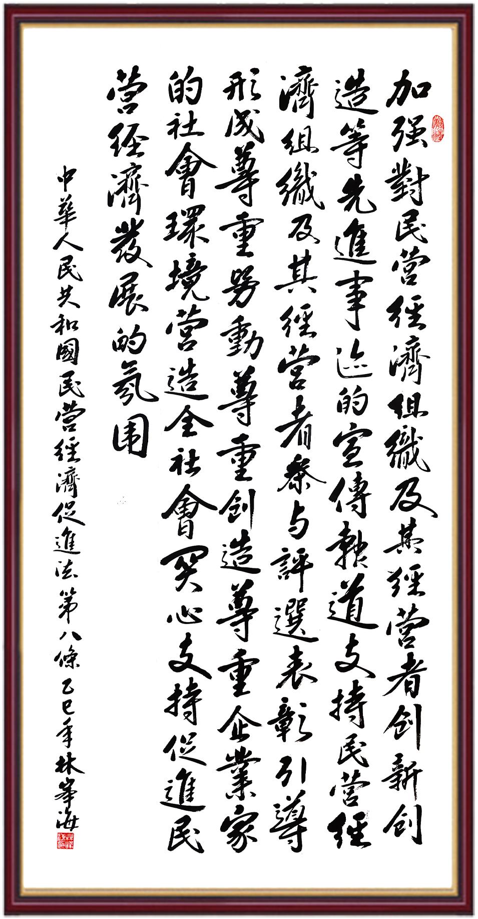《中華人民共和國民營經(jīng)濟(jì)促進(jìn)法》自今年5月20日起施行。作為我國首部專門關(guān)于民營經(jīng)濟(jì)發(fā)展的基礎(chǔ)性法律,民營經(jīng)濟(jì)促進(jìn)法將支持和保障民營經(jīng)濟(jì)發(fā)展的法律制度融入中國特色社會(huì)主義法律體系,具有重大的法治意義,為促進(jìn)民營經(jīng)濟(jì)持續(xù)、健康、高質(zhì)量發(fā)展提供了堅(jiān)實(shí)的法治保障。為更好地學(xué)習(xí)、宣傳、貫徹這部法律,法治日?qǐng)?bào)社聯(lián)合司法部普法與依法治理局,開展“‘書·法’系列活動(dòng)之書寫《中華人民共和國民營經(jīng)濟(jì)促進(jìn)法》”活動(dòng)。