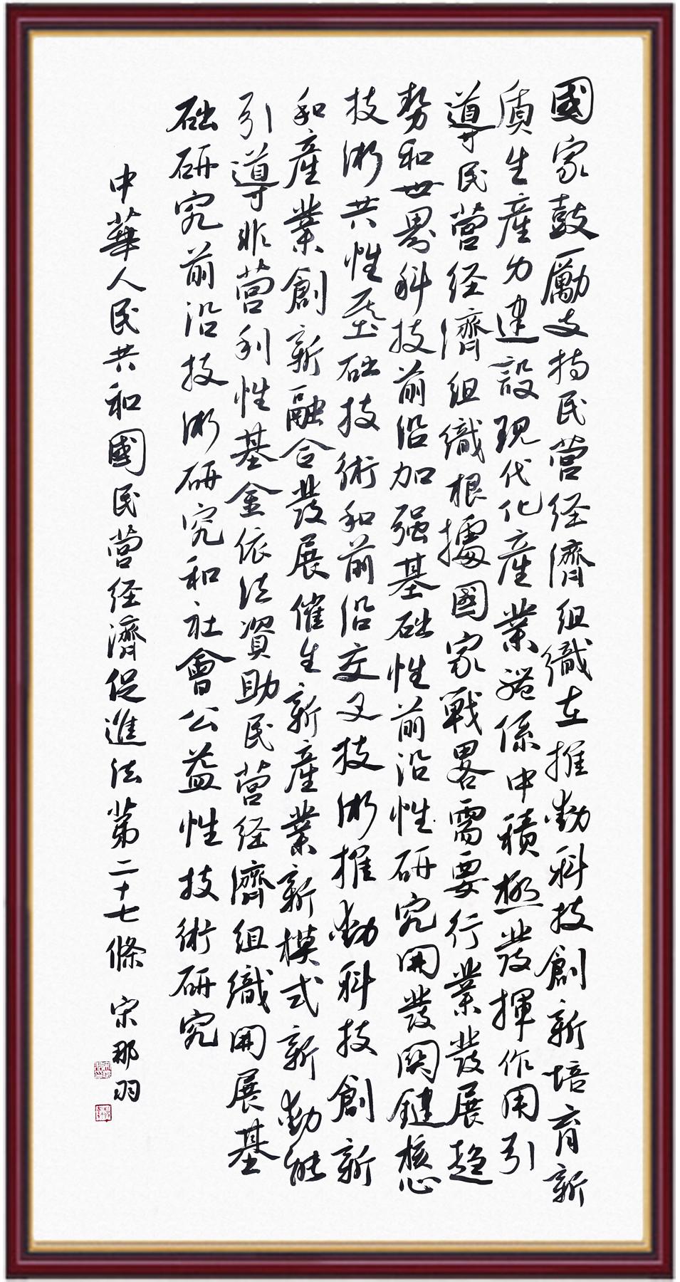 《中華人民共和國民營經(jīng)濟(jì)促進(jìn)法》自今年5月20日起施行。作為我國首部專門關(guān)于民營經(jīng)濟(jì)發(fā)展的基礎(chǔ)性法律,民營經(jīng)濟(jì)促進(jìn)法將支持和保障民營經(jīng)濟(jì)發(fā)展的法律制度融入中國特色社會主義法律體系,具有重大的法治意義,為促進(jìn)民營經(jīng)濟(jì)持續(xù)、健康、高質(zhì)量發(fā)展提供了堅實的法治保障。為更好地學(xué)習(xí)、宣傳、貫徹這部法律,法治日報社聯(lián)合司法部普法與依法治理局,開展“‘書·法’系列活動之書寫《中華人民共和國民營經(jīng)濟(jì)促進(jìn)法》”活動。