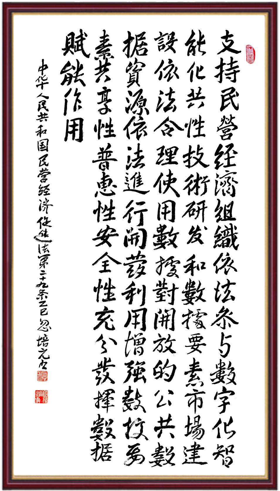 《中華人民共和國(guó)民營(yíng)經(jīng)濟(jì)促進(jìn)法》自今年5月20日起施行。作為我國(guó)首部專門關(guān)于民營(yíng)經(jīng)濟(jì)發(fā)展的基礎(chǔ)性法律,民營(yíng)經(jīng)濟(jì)促進(jìn)法將支持和保障民營(yíng)經(jīng)濟(jì)發(fā)展的法律制度融入中國(guó)特色社會(huì)主義法律體系,具有重大的法治意義,為促進(jìn)民營(yíng)經(jīng)濟(jì)持續(xù)、健康、高質(zhì)量發(fā)展提供了堅(jiān)實(shí)的法治保障。為更好地學(xué)習(xí)、宣傳、貫徹這部法律,法治日?qǐng)?bào)社聯(lián)合司法部普法與依法治理局,開展“‘書·法’系列活動(dòng)之書寫《中華人民共和國(guó)民營(yíng)經(jīng)濟(jì)促進(jìn)法》”活動(dòng)。