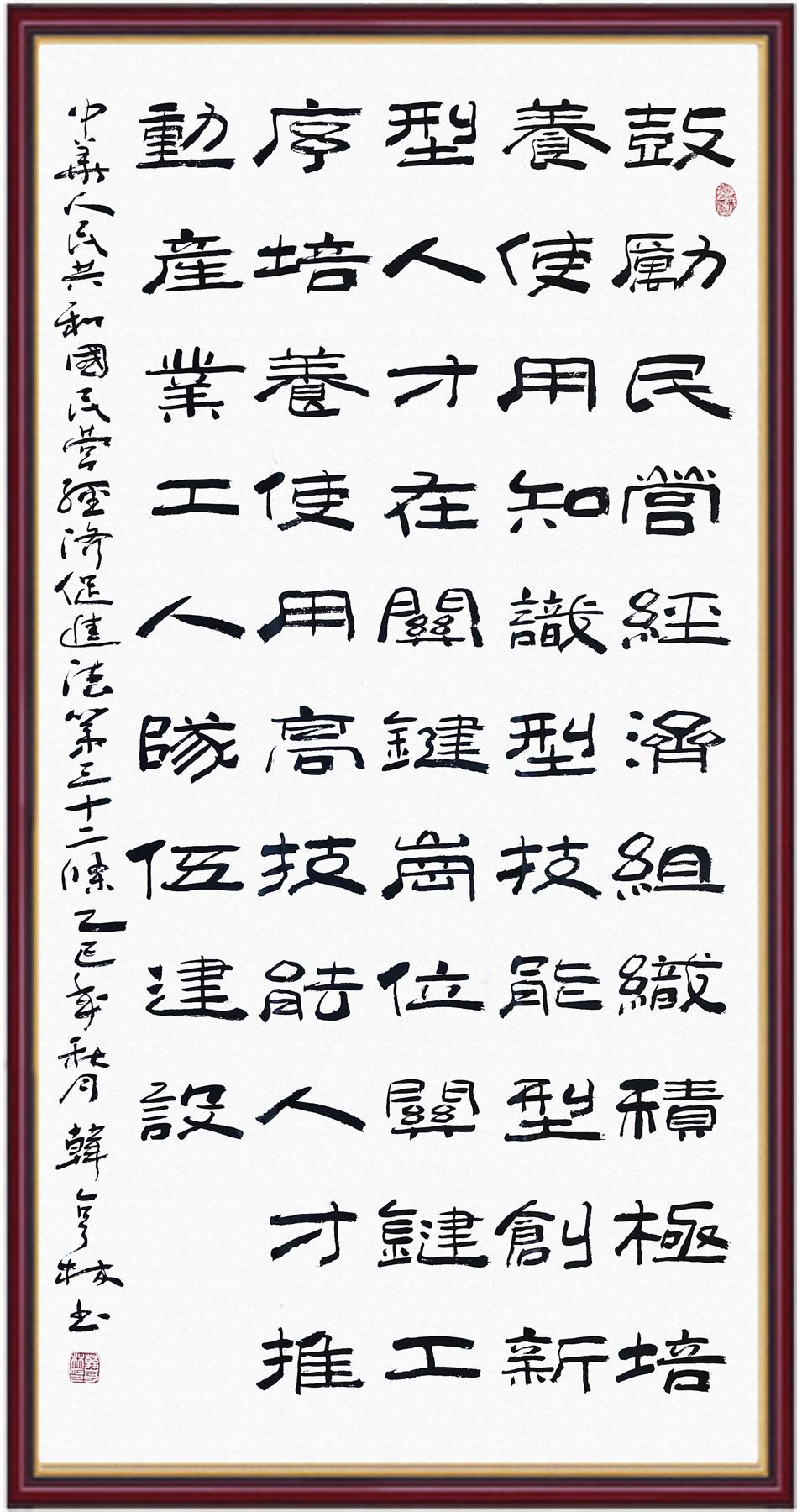 《中華人民共和國(guó)民營(yíng)經(jīng)濟(jì)促進(jìn)法》自今年5月20日起施行。作為我國(guó)首部專門(mén)關(guān)于民營(yíng)經(jīng)濟(jì)發(fā)展的基礎(chǔ)性法律,民營(yíng)經(jīng)濟(jì)促進(jìn)法將支持和保障民營(yíng)經(jīng)濟(jì)發(fā)展的法律制度融入中國(guó)特色社會(huì)主義法律體系,具有重大的法治意義,為促進(jìn)民營(yíng)經(jīng)濟(jì)持續(xù)、健康、高質(zhì)量發(fā)展提供了堅(jiān)實(shí)的法治保障。為更好地學(xué)習(xí)、宣傳、貫徹這部法律,法治日?qǐng)?bào)社聯(lián)合司法部普法與依法治理局,開(kāi)展“‘書(shū)·法’系列活動(dòng)之書(shū)寫(xiě)《中華人民共和國(guó)民營(yíng)經(jīng)濟(jì)促進(jìn)法》”活動(dòng)。