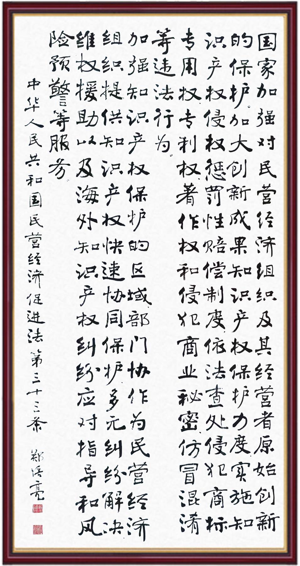 《中華人民共和國民營經(jīng)濟促進法》自今年5月20日起施行。作為我國首部專門關(guān)于民營經(jīng)濟發(fā)展的基礎(chǔ)性法律,民營經(jīng)濟促進法將支持和保障民營經(jīng)濟發(fā)展的法律制度融入中國特色社會主義法律體系,具有重大的法治意義,為促進民營經(jīng)濟持續(xù)、健康、高質(zhì)量發(fā)展提供了堅實的法治保障。為更好地學(xué)習(xí)、宣傳、貫徹這部法律,法治日報社聯(lián)合司法部普法與依法治理局,開展“‘書·法’系列活動之書寫《中華人民共和國民營經(jīng)濟促進法》”活動。