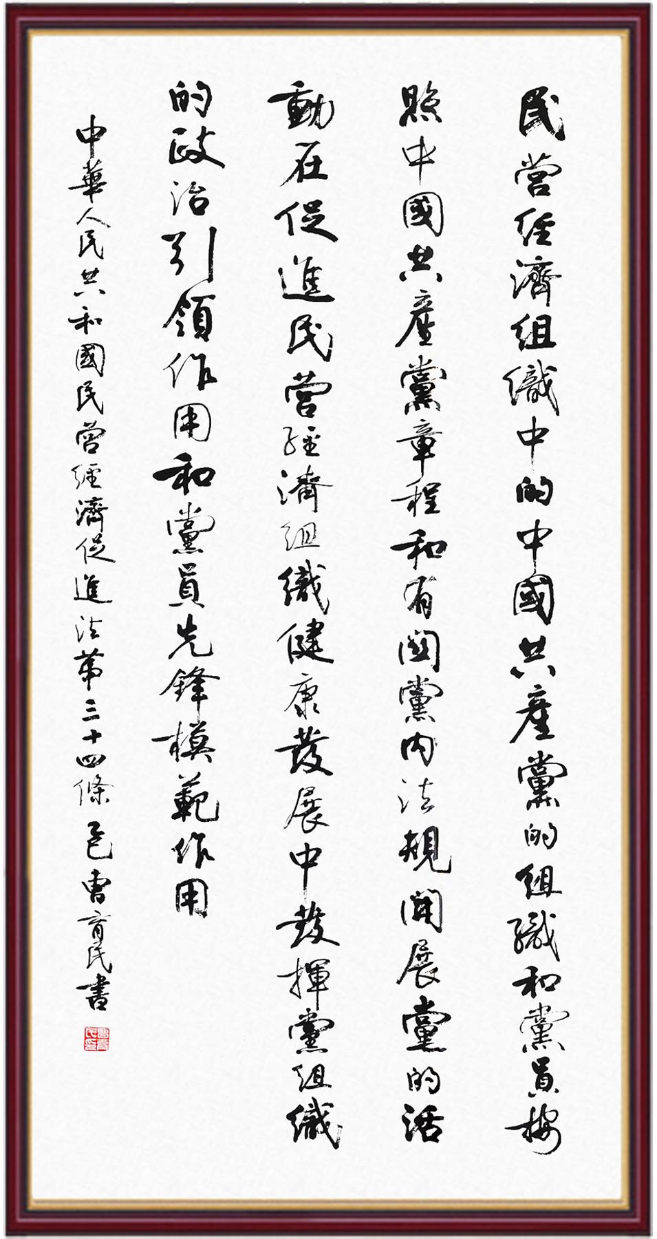 《中華人民共和國民營經(jīng)濟(jì)促進(jìn)法》自今年5月20日起施行。作為我國首部專門關(guān)于民營經(jīng)濟(jì)發(fā)展的基礎(chǔ)性法律,民營經(jīng)濟(jì)促進(jìn)法將支持和保障民營經(jīng)濟(jì)發(fā)展的法律制度融入中國特色社會(huì)主義法律體系,具有重大的法治意義,為促進(jìn)民營經(jīng)濟(jì)持續(xù)、健康、高質(zhì)量發(fā)展提供了堅(jiān)實(shí)的法治保障。為更好地學(xué)習(xí)、宣傳、貫徹這部法律,法治日?qǐng)?bào)社聯(lián)合司法部普法與依法治理局,開展“‘書·法’系列活動(dòng)之書寫《中華人民共和國民營經(jīng)濟(jì)促進(jìn)法》”活動(dòng)。