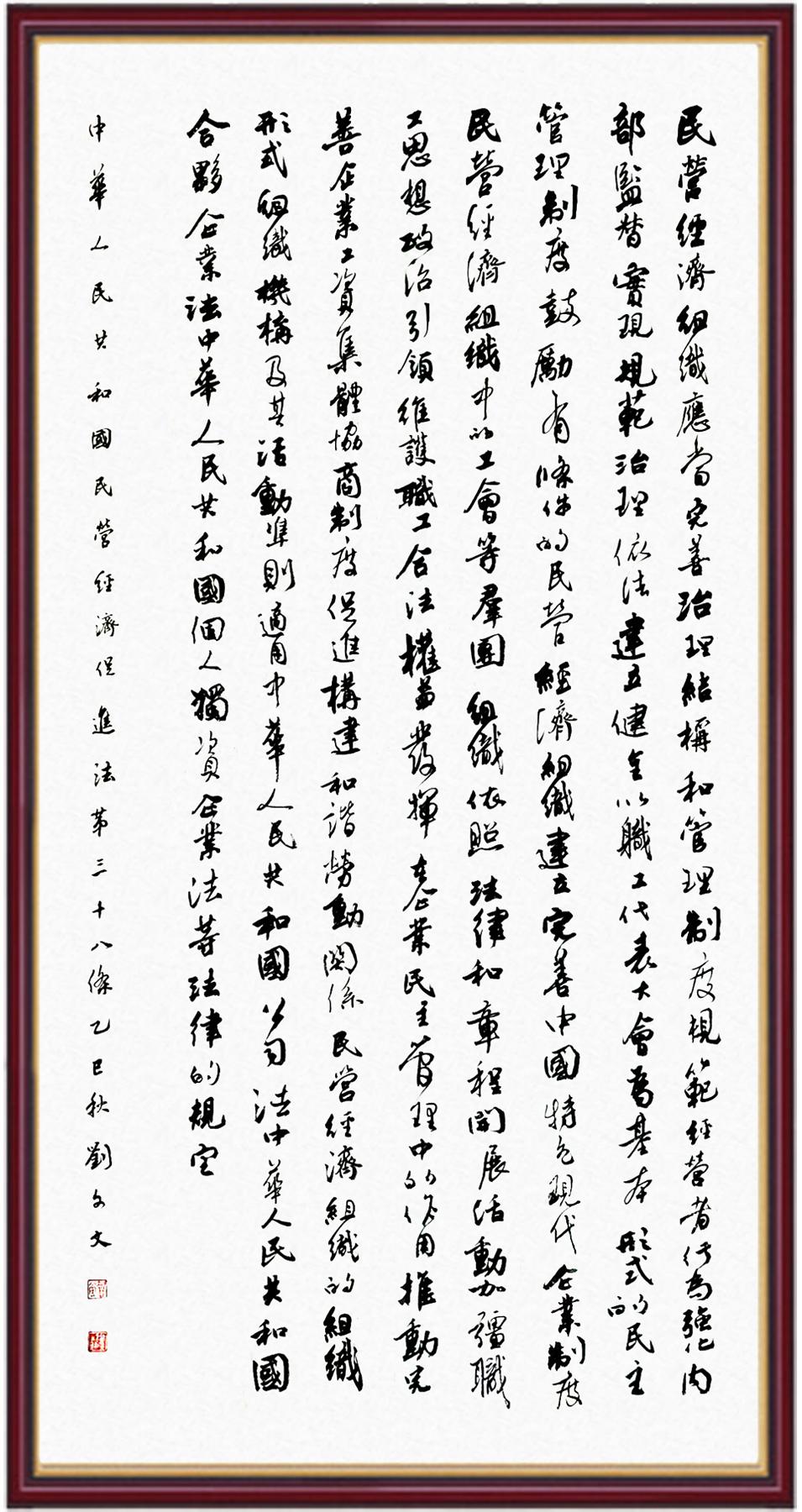 《中華人民共和國(guó)民營(yíng)經(jīng)濟(jì)促進(jìn)法》自今年5月20日起施行。作為我國(guó)首部專門關(guān)于民營(yíng)經(jīng)濟(jì)發(fā)展的基礎(chǔ)性法律,民營(yíng)經(jīng)濟(jì)促進(jìn)法將支持和保障民營(yíng)經(jīng)濟(jì)發(fā)展的法律制度融入中國(guó)特色社會(huì)主義法律體系,具有重大的法治意義,為促進(jìn)民營(yíng)經(jīng)濟(jì)持續(xù)、健康、高質(zhì)量發(fā)展提供了堅(jiān)實(shí)的法治保障。為更好地學(xué)習(xí)、宣傳、貫徹這部法律,法治日?qǐng)?bào)社聯(lián)合司法部普法與依法治理局,開展“‘書·法’系列活動(dòng)之書寫《中華人民共和國(guó)民營(yíng)經(jīng)濟(jì)促進(jìn)法》”活動(dòng)。