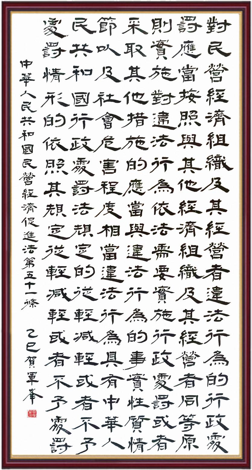 《中華人民共和國(guó)民營(yíng)經(jīng)濟(jì)促進(jìn)法》自今年5月20日起施行。作為我國(guó)首部專門關(guān)于民營(yíng)經(jīng)濟(jì)發(fā)展的基礎(chǔ)性法律,民營(yíng)經(jīng)濟(jì)促進(jìn)法將支持和保障民營(yíng)經(jīng)濟(jì)發(fā)展的法律制度融入中國(guó)特色社會(huì)主義法律體系,具有重大的法治意義,為促進(jìn)民營(yíng)經(jīng)濟(jì)持續(xù)、健康、高質(zhì)量發(fā)展提供了堅(jiān)實(shí)的法治保障。為更好地學(xué)習(xí)、宣傳、貫徹這部法律,法治日?qǐng)?bào)社聯(lián)合司法部普法與依法治理局,開展“‘書·法’系列活動(dòng)之書寫《中華人民共和國(guó)民營(yíng)經(jīng)濟(jì)促進(jìn)法》”活動(dòng)。